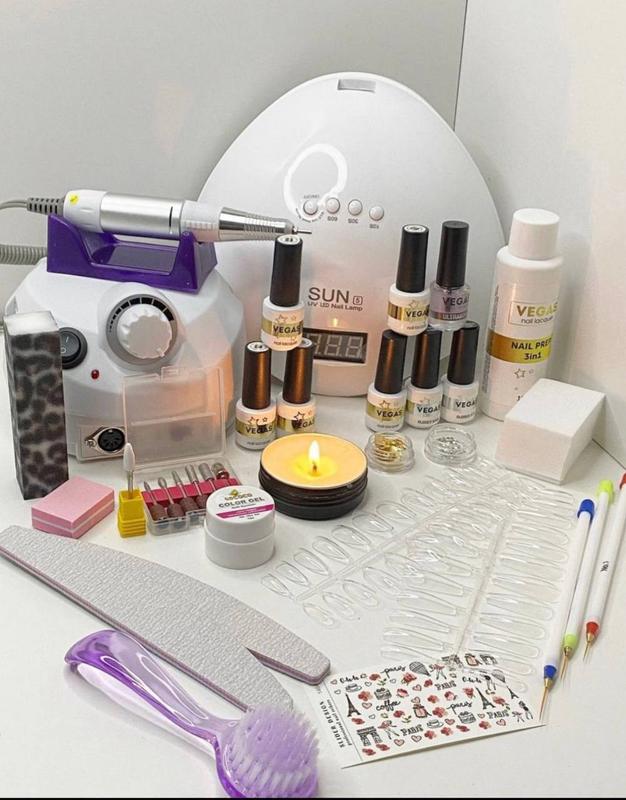 Это удивительный набор который поможет вам без труда покрыть ногти гель лаком и сделать нарастание с помощью гелевых типс. В наборе лампа sun one 48 ватт очень удобная. А фрезер 35000 об минамик вам поможет убрать кутикулы или материал не требуется из ногтей + в комплекте насадка кукурузка 🌽. А мастико для кутикулы в форме свечи очень душистое, кутикула будет мягкая и увлажнена. Подробнее, что входит в набор; 1. Лампа sun one 1 шт 2. Фрезер 35000 об мин 1 шт 3. Набор насадок 1 уп 4. Насадка кукурузка 1 шт 5. База для ногтей vegas 6 мл 1 шт 6. Финиш для ногтей vegas 6 мл 1 шт 7. Ultrabond ( праймер) vegas 6 мл 1 шт 8. Гель лак vegas 6 мл 5 шт 9. Полка для ногтей 2 шт 10. Бафф для ногтей 1 шт 11. Шлифовщек для ногтей 1 шт 12. Гель фарба 5 мл 1 шт 13. Свеча масло для кутикулы 1 шт 14. Наклейка для ногтей 1 шт 15. Гелевые типсы для наращивания 2 блистера 16. Набор кистей из 3 х шт 1 уп 17. Декор для ногтей сусальное золото 1 шт 18. Камешки сваровски для ногтей1 уп 19. Сметка с ручкой для маникюра 1 шт 20. Обезжирение и кленсер vegas 100 мл 1 шт 21. Салфетки без ворсовые 1 уп