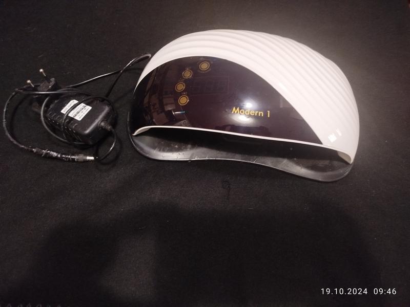 Лампа для сушіння гелю та гель-лаку Modern 1 з вбудованим вентилятором потужністю 120 Вт та таймером на 99 секунд. Має 36 ультрафіолетових ламп. Стан дуже хороший, робочий. Шнур ремонтувався, та наразі перемотан ізолентою. Модель 5241Ю