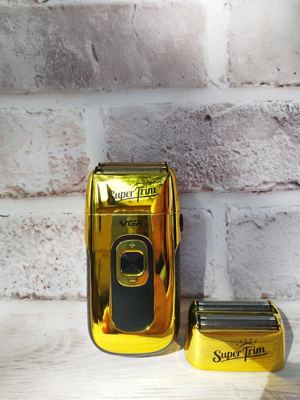 Электробритва Шейвер VGR V-332 Super Trim - профессиональная бритва, которая имеет стильный дизайн и будет отличным подарком для любого мужчины. Питание от литий-ионного аккумулятора 1200mAh. Время работы на полном заряде аккумулятора 150 минут. Время зарядки до 2 часов. Мотор роторный, есть 3 скорости: 6500 об/мин, 7000 об/мин, 7500 об/мин. На ЖК-дисплее отображается индикация заряда и скорость. Лезвия изготовлены из нержавеющей стали, корпус изготовлен из качественного пластика. Корпус имеет противоскользящие силиконовые вставки, благодаря чему шейвер удобно лежит в руке и не выпадает. Электробритва имеет встроенное лезвие триммера, благодаря чему бриться становиться быстрым и качественным. Ваша кожа будет идеально гладкой, без порезов и раздражений. Кнопка Вкл/Выкл. находится на передней панели электробритвы. VGR V-332 Super Trim будет отличным подарком дорогому вам мужчине. Характеристики VGR V-332 Super Trim: Бренд: VGR Материал корпуса: Пластик Цвет: Золотой Материал лезвий: Нержавеющая сталь Противоскользящие вставки Количество режимов скоростей: 6500 об/мин, 7000 об/мин, 7500 об/мин. Питание: от литий - ионного аккумулятора 1200mAh / от сети 220 В Мощность: 8 Вт Время работы на полном заряде аккумулятора: до 150 минут Время зарядки до 2 часов Интерфейс: USB На ЖК-дисплее отображается индикация заряда и скорость. Комплектация: Электробритва - 1 шт Насадка для бритья бороды - 1 шт Насадка для бритья головы - 1 шт Защитный колпачок-1 шт Сумка для хранения - 1 шт Щетка для очистки-1 шт USB кабель для зарядки - 1 шт Инструкция по эксплуатации – 1 шт