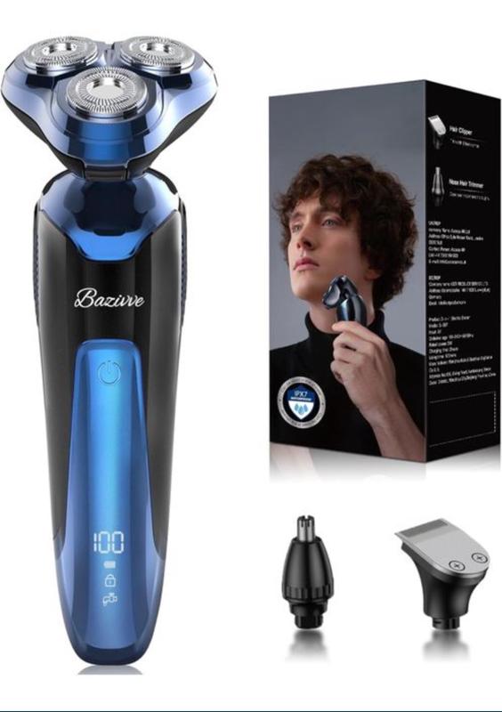 Електробритва 3 в 1 Bazivve Нова, купувалась в Німеччині! Удосконалена 3D плаваюча голівка! Електробритва Bazivve оснащена вдосконаленою плаваючою бритвеною головкою для більш точного гоління. Поєднуючи подвійні прецизійні леза та високошвидкісний двигун, електробритва може ідеально адаптуватися до контурів вашого обличчя, шиї та навіть підборіддя для швидкого та ефективного гоління. IPX7 водонепроникна для сухого та вологого гоління! Корпус, який можна мити, підтримує як сухе, так і вологе гоління. Голіться насухо, якщо ви поспішаєте перед виходом з дому, або використовуйте піну або гель для більш комфортного гоління. Знімну бритвену головку можна промити під проточною водою, тому вам не доведеться надто напружуватися. 120 хв безперервного використання! З практичним USB-кабелем для зарядки та великим акумулятором на 800 мАг, який можна заряджати протягом 120 хвилин і голитися до 120 хвилин - довше, ніж інші. Індикатор залишкового заряду та нагадування про очищення на РК-дисплеї дозволяють уникнути незручностей, пов'язаних із розрядженням або блокуванням лез, тому ви можете користуватися нею без турбот. Travel Lock & Trip Essential Просто активуйте інтелектуальний замок безпеки, затиснувши кнопку ввімкнення/вимкнення на 3 секунди, щоб уникнути несподіваного ввімкнення під час подорожі. Оснащена сумкою для зберігання для зручного транспортування, наша електробритва ідеально підходить для будь-якого бізнесмена та мандрівника. Професійний набір для гоління 3D-обертальна бритва з бакенбардами та тримером для волосся в носі задовольняє різні потреби у голінні. Змінюйте насадки за лічені секунди та завжди дбайте про свій зовнішній вигляд. Стане чудовим подарунком на день народження, день Святого Валентина чи інше свято!