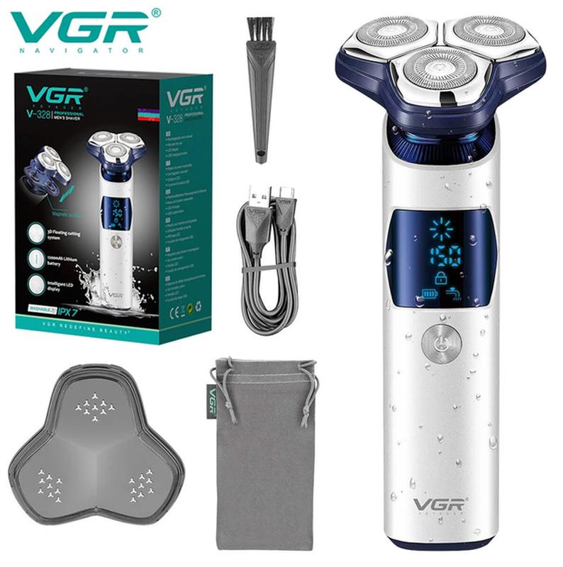 Электробритва VGR V-328 – компактная, бритва шейвер для окантования и сухого бритья. Создана для поддержания гладкой кожи (сухое бритье щетины). Обеспечивает безопасное бритье, удобное в использовании. Мощный заряд позволит бриться несколько раз и не беспокоиться поисками розетки. LED дисплей, показывающий уровень зарядки аккумулятора. Особенности и преимущества электробритвы: • Водонепроницаемый корпус защита максимальная IPX7; • Влажное и сухое бритье, может использоваться с кремом для бритья; • USB зарядка бритвы; • Эргономичный дизайн; • Дорожная блокировка; • Малые габариты экономят место и позволяют брать с собой бритву в любые поездки. Характеристики: LED-дисплей: - показывает уровень зарядки; Индикаторы: чистка бритвы, дорожной блокировки, заряда, работы; Время автономной работы 150 мин; Время зарядки 2 часа; тип питания от аккумулятора; от сети; Материал лезвия: нержавеющая сталь+титан; Супер близкое к коже чистое бритье; Питание USB провод без блока; Использование: для лица, волос, тела, для коротких волос. Материал: пластик; Система бритья: роторная; Напряжение 5 постоянного тока; Роторный двигатель 8500 об/мин; Аккумулятор LI-on 1200 mAh; Мощность 5Вт; Размер: 150Х62Х60мм; Вес: 195гр; Комплектация: электробритва, защитная крышка, USB-провод, щетка, мешочек, подарочная коробка.