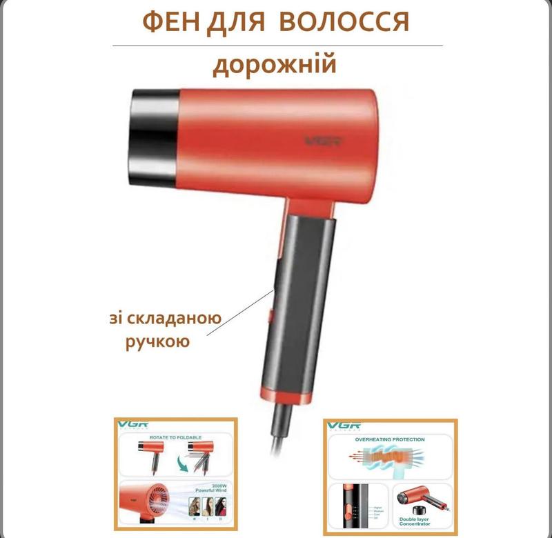 Фен со сложной ручкой для волос VGR V-426 2000Вт. Цвет: красный УПАЖАЕТЕ КОМПАКТНЫЙ И МОЩНЫЙ ФЭН, КАКОЙ НЕ САЙМОЕ МЕСТЕ В ВАШЕЙ ВАЛИЗИ? ДОБРОЖНИЙ ФЕН VGR-426 – ЭТО ТЕ, ЧТО ВАМ МОЩНО! Благодаря ИННОВАЦИОННОЙ СКЛАДНОЙ РУЧЦЕ этот фен легко СКЛАДАЕТСЯ И ТРАНСПОРТУЕТСЯ, что делает его идеальным для путешествий. Он ЗАЙМЕ МАЛО МЕСТЕ В БАГАЖЕ и может быть использован в любом месте, где есть розетка с НАПРУГОЮ 220 В. НЕ СНИМАЮЩИЙ НА КОМПАКТНЫЕ РАЗМЕРЫ, ФЕН VGR-426 САЕТ МОЩНОСТЬ 2000 ВТ, обеспечивающая БЫСТРОЕ И ЭФФЕКТИВНОЕ СОВРЕМЕНИЕ ВОЛОСЫ. Это особенно удобно для девушек с ДОЛГИМ ИЛИ ГУСТИМ ВОЛОСС, ведь время в поездках ограничено, а всегда хочется выглядеть аккуратно. ПЕРЕВАГИ ФЕНА VGR-426: ПОРТАТИВНОСТЬ: Сложная ручка делает фен компактным и легким, что облегчает его переноску и хранение. УДОБСТВО ИСПОЛЬЗОВАНИЯ: Сложная ручка обеспечивает удобное и эргономичное ощущение при длительном использовании. Ее можно настроить в удобное положение, чтобы справиться с длинными сеансами сушки волос. РЕГУЛИРОВАНИЕ ТЕПЛА И БЫСТИ: 2000 Вт мощности гарантируют быструю сушку волос. 3 ТЕМПЕРЕРАТУРНЫЕ РЕЖИМЫ И 2 РЕЖИМЫЕ БЫСТИ позволяют подобрать оптимальный режим для любого типа волос. ФУНКЦИЯ ХОЛОДНОГО ОБДОВЛЕНИЯ поможет зафиксировать укладку и придать волосам блеск. ЗАЩИТА ОТ ПЕРЕГРЕВА делает безопасным использование фена. ХАРАКТЕРИСТИКИ: Напряжение: 220-240 В, 50/60 Гц Мощность: 1600-2000 Вт Количество температурных режимов: 3 Количество режимов скорости: 2 Функция холодного обдува: да Длина шнура: 1,8 м Частота: 50/60 Гц Защита от перегрева