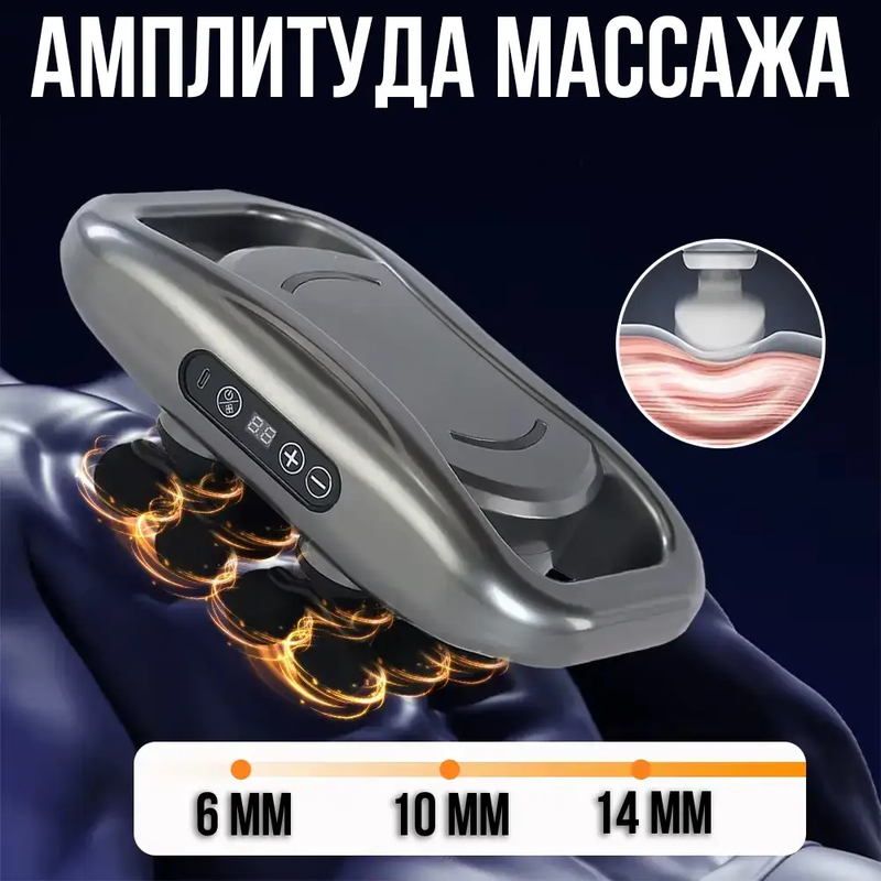 Перкуссионный массажер с дисплеем и 12 массажными головками на 9 режимов массажа RT-608 Массажер перкуссионный RT-608– это мощное устройство для перкуссионного массажа, разработанное для снятия мышечного напряжения, улучшения кровообращения и ускорения восстановления после нагрузок. Благодаря 12 встроенным массажным головкам, он обеспечивает более интенсивный и глубокий массаж, воздействуя сразу на большую площадь тела. Массажер оснащен 9 режимами интенсивности, что позволяет выбрать оптимальный вариант для массажа различных зон: спины, шеи, плеч, талии, ног и других частей тела. Глубокая амплитуда 6-14 мм и высокая частота ударов до 14 400 в минуту обеспечивают эффективное расслабление мышечных фассаций и устранение зажимов. Благодаря тихому двигателю (35-45 дБ) устройство можно использовать даже в общественных местах. Вместительный аккумулятор 2000 мАч обеспечивает до 120 минут автономной работы, а быстрая зарядка за 2-3 часа гарантирует его готовность в любой момент. Светодиодный дисплей отображает выбранный режим и уровень заряда, а эргономичная рукоятка с нескользящим покрытием делает массажер удобным в использовании. Преимущества: 12 массажных головок – глубокий массаж и проработка мышц с большей эффективностью. 9 режимов интенсивности – индивидуальная настройка для разных участков тела. Глубокая амплитуда (6–14 мм) – воздействие на глубокие ткани и фасции. Частота ударов до 14 400 в минуту – мощный и результативный массаж. Бесшумный двигатель (35–45 дБ) – комфортное использование без шума. Аккумулятор 2000 мАч – до 120 минут автономной работы. Быстрая зарядка (2–3 часа) – всегда готов к использованию. Светодиодный дисплей – наглядное отображение режима и заряда. Эргономичная рукоятка – удобный захват, предотвращает скольжение. Компактный и легкий – удобен в переноске и использовании. Характеристики: Тип устройства: перкуссионный массажный пистолет Материал корпуса: пластик Количество массажных головок: 12 Количество режимов: 9 Амплитуда массажа: 6-14 мм Частота ударов: до 14 400 в минуту Уровень шума: 35–45 дБ Дисплей: светодиодный Тип управления: кнопочное Источник питания: аккумулятор Емкость аккумулятора: 2000 мАч Время работы: до 120 минут Час зарядки: 2-3 години Зарядный разъем: USB Type-C Напряжение зарядки: 5 В Рукоятка: нековзна, амортизуюча Вес: легкая Размеры: компактные Цвет корпуса: серый