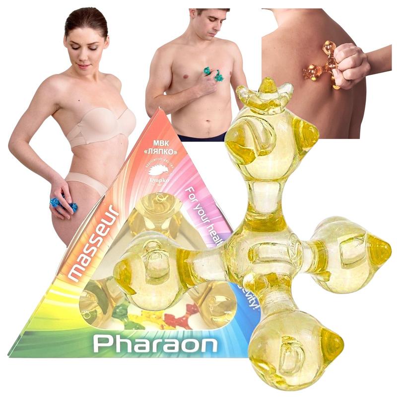 Массажер Фараон Ляпко для массажа спины, тела (снимает боль, напряжение, целлюлит, похудение) ☝ Цвет: синий, голубой, красный, оранжевый, желтый, зеленый, салатовый, белый, черный. Цвета массажеров выбираются случайным образом. По желанию заказчика возможна отправка массажеров в выбранном им цвете, если он имеется на складе на момент выполнения заказа (цвет на характеристики и свойства массажеров не влияет). «Движение -- это жизнь», -- говорили всегда, и это так: здоровье опорно- двигательного аппарата ― основа общего здоровья человека. Польза хорошего массажа состоит в том, что он помогает восстановлению кровообращения и лимфотока в коже и мышцах, а вместе с тем и в костной системе, а также влечет за собой улучшение процесса саморегуляции организма в целом. Массаж пробуждает те силы, заложенные природой, которые помогли выжить человечеству в суровые древние времена. Древние врачи считали, что массаж может поднять на ноги безнадежно больного. Во все времена он поддерживал в людях бодрость духа и гибкость тела. В древности массажеры изготавливались из серебра, золота и ценных пород дерева. Такой подарок служил знаком особого расположения и был доступен только избранным. В наше время трудно представить себе идеальный здоровый образ жизни. Людям приходится в чем-то специализироваться, что приводит к невостребованности некоторых систем организма, и они перестают играть свою роль в жизнеобеспечении человека. А если нет участия в общем процессе какого-либо узла системы, то любая саморегулирующая система рано или поздно выйдет из строя. Известно, что многие болезни возникают в результате нарушения движения энергии по энергетическим каналам или меридианам, ― когда в одних местах энергия находится в избытке, а в других её недостает. В тех местах, где скопилась избыточная энергия, происходит перенапряжение мышц, и нарушаются функции других систем организма, следствием чего является сдавливание верхних рецепторов нервных стволов. Это влечет за собой дегенерацию нервно-мышечной системы. Далее вышеуказанный участок переходит в участок недостатка энергии. Этот участок не способен эффективно выводить вредные вещества и шлаки из организма, что влечет за собой создание условий для возникновения отеков, доброкачественных опухолей, нередко переходящих в злокачественные. Если избыточная энергия скапливается в железах внутренней секреции, в организме нарушается гормональный баланс. Измененная энергетика может провоцировать образование узлов в щитовидной железе. Восстановить гармонию в системе призван массаж. Суть метода заключается в том, чтобы застоявшуюся энергию привести в движение, восстановить связь с остальными, нормально функционирующими системами, отрегулировать энергетический баланс и закрепить в главном нервном центре информацию о том, что они снова могут гармонично работать в нормальном, т. е. здоровом режиме. Все эти проблемы решает быстро, надежно и эффективно Ваш «домашний доктор» ― массажер «Фараон»! В массажере «Фараон» заложена идея трехгранной пирамиды, которая, являясь прообразом четырехгранной пирамиды, унаследовала ее целительные свойства. Трехгранная пирамида является символом гармонии, поскольку грани и стороны ее расположены под равными углами друг к другу. Изготовленный из экологически чистого изн