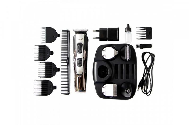 GEMEI GM-592 9 в 1 отличный подарок для современного мужчины, который следит за своей внешностью и любит во всем аккуратность и организованность. На цельной подставке грамотно расположена сама машинка GEMEI GM-592 и сопутствующие аксессуары. Каждая из существующих из десяти насадок в наборе имеет свое строгое предназначение, благодаря этому комплекту мужчина может поддерживать в идеальном состоянии свои усы и бороду, регулировать длину спрыгиваемых волос, а также деликатно избавляться от лишнего волос в носу и ушах. Технические характеристики: Эргономичный дизайн; Встроенный аккумулятор; Время работы от батареи: до 40 минут непрерывной работы; Время зарядки батареи: до 5 часов; Кнопка увеличения скорости (турбо-режим); Вход адаптера: AC 220V-240V Размеры (с упаковкой): 17,8 х 22,5 х 7,2 см;