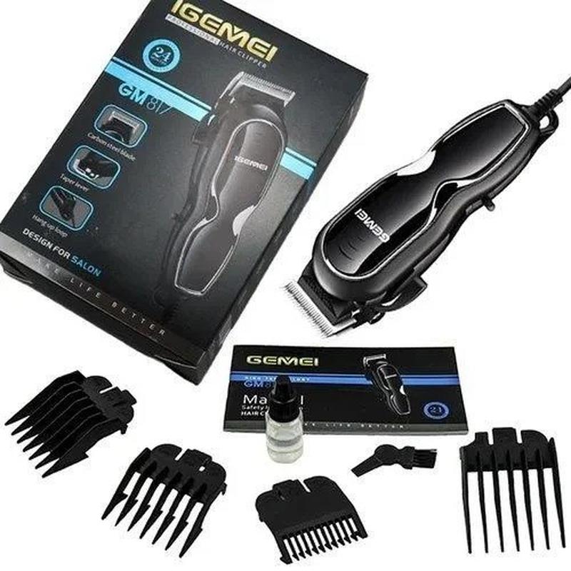 Професійна машинка для стриження волосся Gemei GM-817 Pro Чорний + Щітка для чищення ножів Машинка для стриження волосся GM-817 обладнана безшумним і потужним анкерним вібродвигуном. Дає змогу в домашніх умовах зробити модну зачіску або підтримувати її, без послуг перукаря. Машинка для стриження волосся незамінна річ для тих, хто стежить за своєю зовнішністю! До комплекту входить всі необхідні засоби для догляду та чищення машинки для стриження. Модель має зручний перемикач висоти стриження, що допомагає моделювати зачіску! Прекрасно підійде для професіоналів або для використання в домашніх умовах. Легкий корпус пристрою й ергономічна форма ручки гарантує зручне користування. Модель Gemei Gm 817 має низький рівень шуму та вібрації, завдяки чому Ви не відчуєте жодного дискомфорту під час роботи. Характеристики: Виробник: Gemei Живлення: мережа -220-240 V 60/50Гц Споживана потужність: 10 Вт Лезо: неіржавка сталь завширшки 46 мм. Комплектація Машинка для стриження волосся GM-817 4 насадки (3 мм, 6 мм, 9 мм, 12 мм) Щітка для чищення ножів Олія Захисний ковпачок. Інструкція англійською мовою Коробка