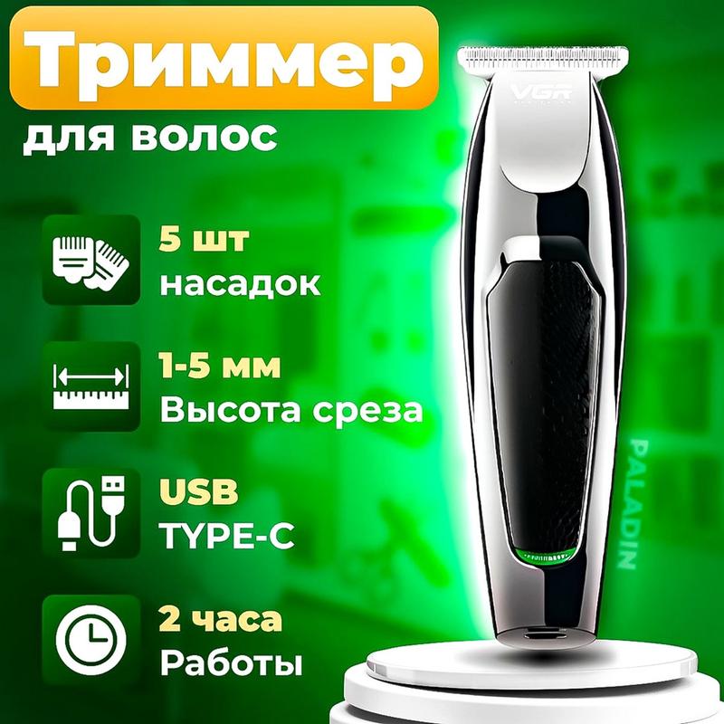 Триммер для бороды и стрижки, Триммер для самостоятельной стрижки волос, NST Триммер VGR является незаменимым инструментом в работе мастеров моделирования стрижек. Он предназначен для профессионального использования в парикмахерских, салонах красоты, барбершопах и разрешен к применению в домашних условиях. Триммер VGR отличается прочным корпусом, устойчивым к воздействию вибрации, низким уровнем шума, стильным дизайном, плавным ходом острых лезвий, удобством и длительным сроком эксплуатации. Особенности: - Со сменными насадками возможно придать идеальную форму бороде и усам; - Оборудован лезвиями из нержавеющей стали, гарантирующими аккуратный ровный срез она аккуратно срезает волоски, не оставляя каких-либо следов на чувствительной коже; - Аккумулятор позволят триммеру работать автономно в течение 120 минут; - Он функционален и прост в управлении; - Прочный корпус, устойчивый к воздействию вибрации, низкий уровень шума. Ход - очень плаваний; - Стильный дизайн; - Удобно ложится в руке и имеет лёгкий вес; - Подходит как для детей, так и для взрослых; - Идеальный помощник в командировках. Характеристики: - Тип: Триммер для бороды и усов; - Тип питания: Аккумулятор; - Мощность: 5 Вт; - Аккумулятор: 600 mAh; - Время до полной зарядки аккумулятора: 120 минут; - Время работы от аккумулятора: 120 минут; - Материал лезвий: нержавеющая сталь; - Регулировка длины: сменные насадки; - Количество сменных насадок: 5 штук (1 мм, 2 мм, 3 мм, 4 мм, 5 мм); - Размер триммера: 15 х 4,5 х 3,5 см; - Вес: 131 грамм. Комплектация: - Триммер - 5 насадок (1 мм, 2 мм, 3 мм, 4 мм, 5 мм); - Защитная колпачок на лезвия; - Масло для смазки ножей; - Щетка для очистки триммера; - USB кабель для зарядки (есть возможность заряжать в автомобиле или от Power Bank); - Инструкция (на английском языке); - Фирменная заводская коробка.