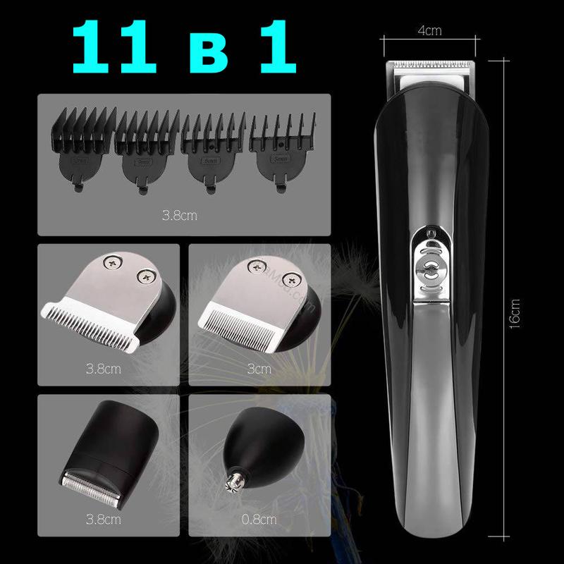 Тример для самостійного стриження волосся (111в1), Тример для бороди та стриження, NST Характеристики - Призначення: Борода, Вуса, Нос, Вуха, Тіло, Обличчя; - Потужність: 5 W; - Тип живлення: Акумулятор; - Тип акумулятора: NiMH; - Корпус: пластиковий; - Леза: нержавіюча сталь; - Насадки: 11 шт.; - Мінімальна довжина стриження: 1 мм; - Максимальна довжина стриження: 12 мм; - Інтервал довжини: 1 мм; - Можливість промивання ножів під водою: Так; - Самозаточувальні леза: Так; - Час безперервної роботи: 80 хвилин; - Час заряджання: 2 години; - Довжина мережевого шнура: 1 м; - Колір: Чорний. Комплектація 1. Тример 2. 11 насадок 3. Олія для змащення; 4. Гребінець; 5. Підставка; 6. Блок для заряджання приладу.