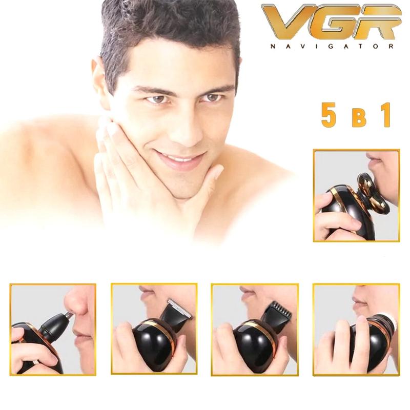 Универсальный мужской тример для стрижки (5в1), Триммер для стрижки волос дома, NST Незаменимый, ежедневный помощник для каждого мужчины. Многофункциональность данной модели электробритвы не перестанет вас удивлять и радовать. Великолепное качество исполнения и превосходная работа роторного мотора легко справляется с любым типом щетины и волос. Компактный дизайн бритвы в сочетании с естественными движениями запястья значительно увеличивает эффективность круговых движений, необходимых для качественного бритья роторной бритвой. Бритва полностью повторяет контуры лица и легко скользит по коже. Значительно меньше в размерах, чем обычная бритва, это устройство увеличивает эффективность круговой техники движения, которая является необходимой для бритья с роторными бритвами. Особенности электробритвы: - Низкий уровень шума; - Подходит для сухой, а также влажной кожи; - Эргономичный дизайн и компактный размер; - Индикатор зарядки и подсветка; - Съемная бритвенная головка для легкой очистки и ухода; - Тонкий триммер для безопасной, нежной обрезки и формирования бороды; - Плавающий триммер для бакенбардов; - Водонепроницаемость. Можно мыть непосредственно с помощью водопроводной воды, что является безопасным и практичным; - Вращающаяся головка 5D. Двойное кольцо независимое плавающее лезвие. Умная плавающая система, 360 ° подстроится под любой профиля лица; - Двойное кольцо для бритья волос, плавающая сеть ножей, сбреет более близко к корню волос, может быстро удалить волосы, не повредить кожу; Характеристики: - Цвет: черный с золотистым - Тип электробритвы: роторная - Материал: АБС-пластик, металл - Количество режущих головок: 5 - Светодиодный дисплей: показывает заряд аккумулятора - Влагозащищенный корпус IPX5 - Напряжение: 5 В - Вес электробритвы: 170 г - Размер бритвы (Д/Ш/В): 11х6х7 см - Размер режущей 5D головки (Д/Ш): 5.5х5.5 см - Работает от: литиевой батареи - Заряжается от USB - Время зарядки: около 2-х часов - Время работы на одном заряде: 60 минут - Мужская многофункциональная бритва: электробритва-триммер для бороды, головы, носа + щеточки для чистки лица - Бритье влажное и сухое - Страна производитель: Китай - Тип упаковки: картонная Комплектация: - Электробритва VGR - Насадка "триммер" и четыре гребня-насадки (3, 6, 9, 12 мм) - Насадка на бритву для носа и ушей - Щетка для глубокого очищения лица и силиконовая - Защитная крышка для режущей головки - Щеточка для чистки электробритвы: 1 шт - Инструкция на английском и др. языках - Картонная упаковка