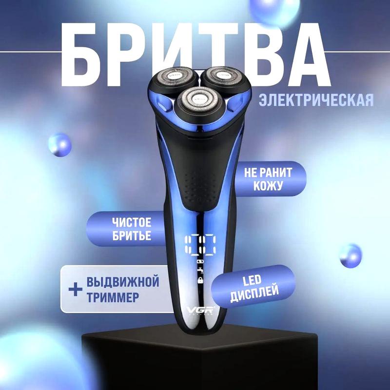 Бритва акумуляторная, Бритва триммер для мужчин универсальная, NST Электробритва для влажного и сухого бритья VGR - это электрический станок для бритья. Он станет простой и функциональной альтернативой громоздким электробритвам Электробритва работает от встроенного аккумулятора, который необходимо заряжать по мере необходимости. Острые ножи станка бреют гладко, не оставляя порезов и раздражения на коже. Стильный современный дизайн станка понравится мужчине любого возраста. Компактный размер бритвы позволит брать с собой в длительные поездки, командировки или путешествия. Особенности: - Водонепроницаемый дизайн, может использоваться в ванной комнате; - Влажное и сухое бритье, можно использовать с кремом для бритья; - Быстрая и безопасная зарядка за 1,5 часа. Автономное время работы от аккумулятора составляет около 90 минут. Характеристики: - Фирма: VGR; - Мощность: 5 Вт; - Тип бритья: Сухое/влажное; - Время автономной работы от аккумулятора: 90 минут; - Быстрая зарядка: 1.5 часа; - Емкость аккумулятора: 800 mAh; - Бритвенная система: Роторная (вращательная); - Степень влагозащиты: IPx7; - 3 плавающих головки; - USB зарядка бритвы; - ЖК дисплей (показывает процент заряда батареи); - Откидной триммер; - Размер: 16 х 6 х 5 см; - Вес: 184 грамма. Комплектация: - Электробритва VGR V-306; - Защитная крышка для лезвий; - Щеточка для очистки бритвы после использования; - USB шнур для зарядки; - Инструкция (на английском языке); - Фирменная заводская упаковка.