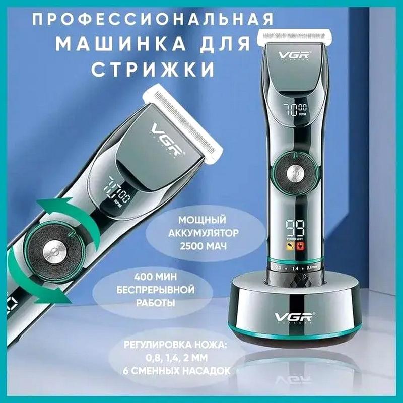 Триммер с насадками для бритья, Триммер станок для бритья, Триммер для бритья для мужчин, NST VGR - это аккумуляторная беспроводная машинка для стрижки волос и бороды с футуристическим дизайном и фантастической точностью среза. В машинке сошлось воедино все самое необходимое для идеальной стрижки: нож из стали шириной 45 мм и высотой среза 0.8 мм, литий ионный аккумулятор без эффекта памяти, увеличенное время автономной работы (до 400 минут) и LCD дисплей. Преимущества: - Мощный надёжный роторный мотор с регулировкой оборотов от 5500 об./мин. до 7500 об/мин, который позволяет справиться с волосами различной густоты и текстуры; - Аккумуляторно-сетевой тип питания позволяет продолжать использовать машинку для стрижки клиента после полной разрядки аккумулятора; - Можно подключить к зарядке через удобную подставку, которая идёт в комплекте, а также напрямую; - Комплектуется 6-мя насадками длинной 1.5 / 3 / 4.5 / 6 / 9 /12 мм; - Регулировка длинны лезвия от 0.8 до 2 мм. Характеристики: - Номинальная мощность: 10 Вт; - LED дисплей с индикатором заряда аккумулятора и оборотов мотора; - Ширина ножа: 45 мм; - Время полной зарядки: 3.5 часа; - Время работы от аккумулятора: до 400 минут (заявлено производителем); - Емкость аккумулятора: 2500 мАч; - Регулировка оборотов машинки: 5500-7500 об/мин; - Регулировка среза лезвий: 0.8/ 1.4 / 2.0 мм. Комплектация: - Машинка для стрижки - Подставка-зарядная станция; - Масло для смазки лезвий; - Щеточка для очистки; - Насадки - 6 штук разной длины; - Подставка для зарядки; - Кабель для зарядки; - Фирменная упаковка.