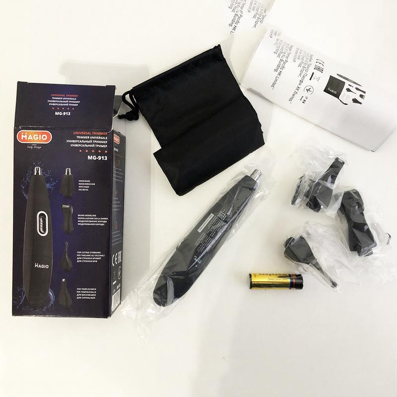 Триммер MAGIO MG-913 KA-863 Aqua 4в1 Многие мужчины бреются каждый день; но игнорируют волосы в носу; ушах; на бровях; висках; шеи и поддерживание бороды в ухоженном виде Универсальный триммер MG-913 идеальное решение для удаления нежелательных волос и моделирования волос; очень удобный и многофункциональный; позволит подстричь волосы на голове; удалить волосы из ушей и носа; а также привести в порядок и постоянно поддерживать в идеальном состоянии брови; усы и бороду Универсальный триммер MG-913 имеет красивый дизайн с Soft touch покрытием; компактный и удобный в руке Низкий уровень вибрации и шума Работает от одной батареи типа АА (входит в комплект); а также является водонепроницаемым; что облегчает использование и позволяет пользоваться им в душе Лезвия выполнены из нержавеющей стали с технологией Protect cut; что обеспечивает безопасную и комфортную работу с триммером и защищает кожу от раздражения Лезвие после использования можно чистить с помощью щеточки; которая идет в комплекте; а также можно промывать под струей воды Съемные и моющиеся насадки легко снимаются и очищаются Полезный аксессуар; такой как мешочек; облегчает хранение всего комплекта триммера и является идеальным вариантом для путешествий Совет – после использования триммера в воде; обязательно нужно вытереть прибор насухо чтобы предотвратить рост бактерий и обеспечить длительную работу Универсальный триммер MG-913 имеет 4 насадки: насадка для стрижки в носу и ушах (1;5 мм) С помощью этой насадки можно быстро; безопасно и безболезненно удалить нежелательные волосы в носу и ушах Абсолютно не повреждает нос и уши и их кожу Совет – во избежание травмирования носа и барабанной перепонки не стоит устанавливать насадку в нос и ухо глубже 1 см Насадка–тонкий триммер для создания контуров бороды или эспаньолки (0;8 мм) С помощью такой насадки можно деликатно и аккуратно моделировать разнообразные стили и формы бороды; в том числе и эспаньолки; позволяет точно и ровно подстричь любой нужный контур Насадка для бороды; висков и шеи (0;8 мм) с насадкой-расческой для регулирования длины (3; 4; 5; 6; 7 мм) Достаточно полезная и нужная насадка; с помощью которой с лёгкостью можно проработать такие зоны; как виски (бакенбарды); борода и шея Идеальный вариант для стрижки любой желаемой длины бороды; благодаря специальной насадке-расческе с регулированием длины Совет – для моделирования висков проводить устройством обязательно сверху вниз; а при моделировании шеи – снизу вверх! Насадка для стрижки бровей (0;5 мм) с насадками-расческами для регулирования длины Идеальный вариант для моделирования бровей; так как благодаря насадкам- расческам в наборе; есть возможность регулировать разную длину бровей Насадка очень удобна в использовании; позволяет очень легко произвести коррекцию бровей Совет – изначально желательно выбрать насадку-расческу с большей длиной; чтобы не срезать больше волос чем нужно; а если хочется удалить больше волос; тогда заменить на ту; что с меньшей длиной Универсальный триммер MG-913 4 в 1 удовлетворит любые потребности в уходе за собой! Характеристики - Тип: для носа и ушей - Лезвие из нержавеющей стали - Питание: от батарейки типа АА (1шт) - Насадки: 4 шт - Цвет: черный Условия доставки - Новая почта - Точка выдачи Rozetka - Укрпочта Условия оплаты - Наложенный платеж! - Безопасная сделка (ПромОп