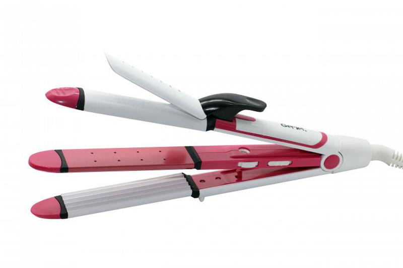 Плойка для волос Gemei 3в1 Model:GM2921 Каждая женщина ежедневно экспериментирует над своей внешностью. Теперь вы можете создавать свой образ без использования утюжков или бигудей. Стайлер Gemei GM 2921 3в1 выполняет их функцию. Согласитесь, лучше иметь один прибор, чем несколько. Плойка Gemei GM 2921 3в1 выполняет функцию сразу трех приборов. С его помощью вы можете как накрутить волосы, так и выпрямить. Такое устройство должна иметь каждая девушка. Стайлер выполняет такие функции, как: гофре, плойка, выпрямитель. Он один выполняет функции трех отдельных устройств. Плойка Gemei GM 2921 3в1 очень удобный в использование. Температура нагрева составляет 200 градусов. Такое устройство хорошо подходит для такого типа волос, как густой и нормальный. Если у вас поврежденные волосы, то необходимо на одну прядь выделять всего пару секунд. Ведь если на них оказать большое влияние, то вы еще больше их повредите. Стайлер Gemei GM 2921 3в1 имеет разные насадки, которые позволяют создавать разные образы. Устройство равномерно нагревается и это позволяет делать качественную прическу. Также имеется шнур, который не запутывается потому, что вращается вокруг своей оси. Технические характеристики Gemei GM 2921 3в1: * Имеет алюминиевое покрытие; * Мощность составляет 60 Ватт; * Работает от сети в 220 Вольт; * Есть специальный дополнительный индикатор