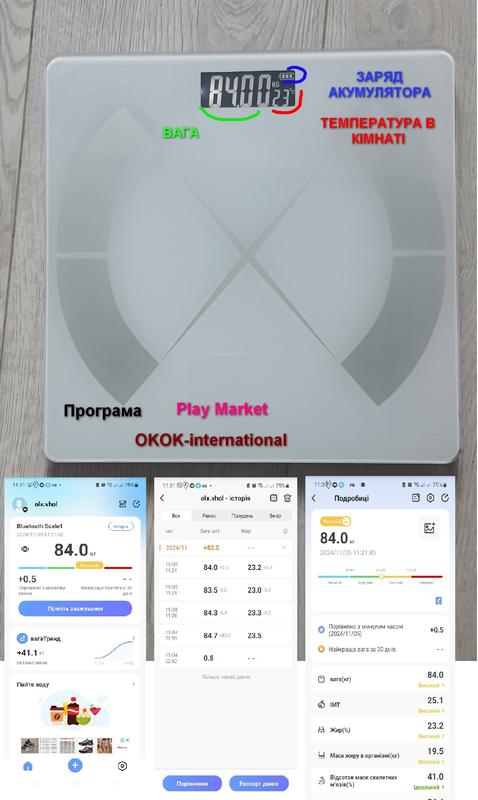 Эти весы не требуют батареек. Достаточно зарядить с USB и заряда аккумулятора хватит на декилка месяцев работы. Имеет также встроенный градусник - отображает температуру в комнате. С помощью технологии Bluetooth, эти весы могут подключаться к Вашему смартфону или планшету, что позволяет легко отслеживать изменения своего веса и других параметров здоровья. Вы можете использовать специальное приложение, чтобы получить подробную информацию о своем весе, индексе массы тела (ІМТ), количестве жира, мышечной массы и других показателях. Также в приложении есть возможность установки целей и отслеживания прогресса достижения этих целей. Приложение загружается с Play Market : название приложения OK-International. Приложение поддерживает украинский язык. Эти умные весы могут взвешивать до 180 кг. Имеют стильный дизайн. Кроме того, они имеют дисплей с подсветкой, который обеспечивает яркость и четкость отображения результатов измерений. Преимущества: Весы напольные можно использовать в ванной комнате, с примесью и без него Умные весы позволяют вам легко и удобно передавать ваши измеренные значения на смартфон Вы сможете управлять своей личной статистикой в приложении "ОКОК" Электронные весы идеально подходят для любителей спорта и тех, кто пытается достичь своего оптимального веса Характеристики: Тип веса: электронные Максимальный вес: 180 кг Материал платформы: закаленное стекло Точность измерения: 50 г Дисплей: так Питание: встроенный аккумулятор