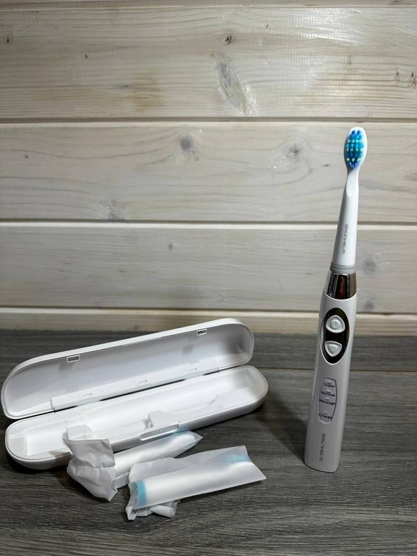 Электрическая зубная щетка отличный помощник в поддержании гигиены полости вашего рта. Щетка эффективнее удаляет зубной налет, чем простые зубные щетки. Не стоит забывать, что щетка абсолютно безопасное устройство, бережно относится к эмали и десен, с ней ваши зубы будут сиять красотой и здоровьем. Характеристики: Технология чистки: Звуковая Количество режимов: 3 Степень жесткости: Средняя Питание: Аккумулятор Время работы: до 30 дней Назначение: Повседневное, Деликатное, Отбеливание, Массаж десен, Чистка межзубных карманов Количество колебаний, кол/мин: 40000 Насадки: 3 насадки Комплектация: Зубная щетка, 3 х Насадки, Дорожный кейс, Кабель для зарядки, Руководство пользователя Особенности: Индикатор зарядки, Водонепроницаемый корпус, Таймер Цвет: Белый