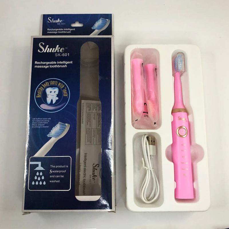 Электрическая щетка Shuke SK-601 Информация и характеристика: - цвет: розовый (есть еще белый и черный) - 5 режимов работы (чистка, полировка, отбеливание, уход за деснами, отзывчивый уход) - головка щетки съемная, поэтому ее можно заменить - водонепроницаемость IPX7 - плотная круглая кисть - м’яка щетина - нетоксична пластмаса - удобный и компактный органайзер - защитные колпачки каждой насадки - движение головки щетки: вибрирующий (260 микровибраций в минуту) - интеллектуальный таймер: каждые 30 секунд автоотключения через 2 минуты - рабочее напряжение: 3.7V - емкость аккумулятора: 600mAh - время зарядки: около 6 часов - мощность: 3W - размер: 21 x 3 см - вес: 65 г - страна: Китай Комплектация: - щетка - кабель для зарядки - 4 насадки - колпачок для щетки - коробка Цена: 296 грн.