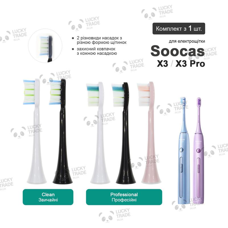 ▷ Все цвета данного товара посмотреть можно тут ◁ 1 шт. Насадка зубной щетки Xiaomi Soocas X3 Pro / X3 Данный товар произведен сторонним производителем, но имеет хорошее качество и относительно небольшую цену. В насадке используються высококачественные антибактериальные щетинки высокой плотности из материала фирмы DuPont. Верх щетинок закруглен во избежание кровоточивости десен. Каждая насадка с защитным колпачком в индивидуальной вакуумной упаковке, предварительно стерилизована ультрафиолетовыми лучами. При изготовлении насадок используется новый процесс посадки волос без меди, нижняя часть щетины формируется в единое целое путем горячего плавления. Насадки высокого качества обеспечивают профессиональный уход за полостью рта. Щетинки высокой плотности, эффективно очищают полость рта. Насадка плотно сидит на щетке без люфта. Через 3 месяца обычного использования насадки головка щетки изнашивается и очищающая способность снижается. Рост бактерий угрожает здоровью полости рта, поэтому рекомендуем вам заменять насадку через каждые 3 месяца использования. Есть такие разновидности насадок: • Clean (обычные) – Белый, Черный • Professional (профессиональные) – Белый, Черный, Розовый Комплектация: насадка 1 шт в индивидуальной вакуумной упаковке. ⚡ при покупке 3 одинаковых насадок, насадки будут дополнительно в коробке. Среди совместимых моделей: • Soocas X3 • Soocas X3 Pro ✅ для более подробной информации о совместимости насадок к вашей электрощетке от Soocas обращайтесь к нашему консультанту. 🔔 Характеристики и комплектация товара могут изменяться производителем без уведомления