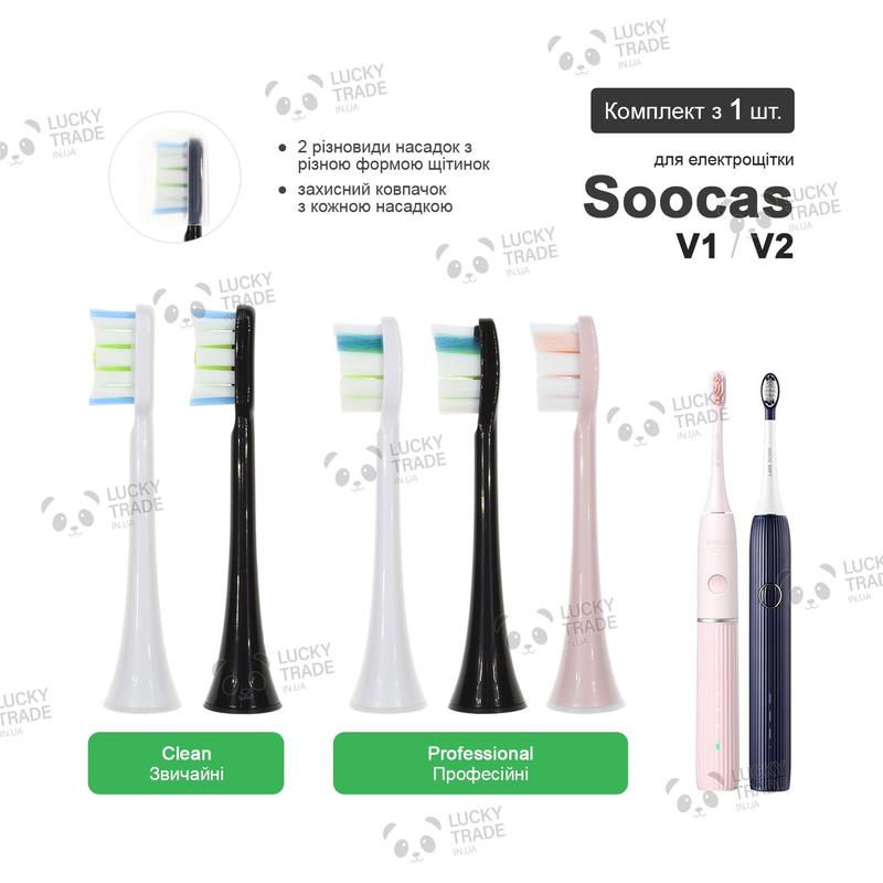 ▷ Все цвета данного товара посмотреть можно тут ◁ 1 шт. Насадка зубной щетки Xiaomi Soocas V2 / V1 Данный товар произведен сторонним производителем, но имеет хорошее качество и относительно небольшую цену. В насадке используються высококачественные антибактериальные щетинки высокой плотности из материала фирмы DuPont. Верх щетинок закруглен во избежание кровоточивости десен. Каждая насадка с защитным колпачком в индивидуальной вакуумной упаковке, предварительно стерилизована ультрафиолетовыми лучами. При изготовлении насадок используется новый процесс посадки волос без меди, нижняя часть щетины формируется в единое целое путем горячего плавления. Насадки высокого качества обеспечивают профессиональный уход за полостью рта. Щетинки высокой плотности, эффективно очищают полость рта. Насадка плотно сидит на щетке без люфта. Через 3 месяца обычного использования насадки головка щетки изнашивается и очищающая способность снижается. Рост бактерий угрожает здоровью полости рта, поэтому рекомендуем вам заменять насадку через каждые 3 месяца использования. Есть такие разновидности насадок: • Clean (обычные) – Белый, Черный • Professional (профессиональные) – Белый, Черный, Розовый Комплектация: насадка 1 шт в индивидуальной вакуумной упаковке. ⚡ при покупке 3 одинаковых насадок, насадки будут дополнительно в коробке. Среди совместимых моделей: • Soocas V2 • Soocas V1 ✅ для более подробной информации о совместимости насадок к вашей электрощетке от Soocas обращайтесь к нашему консультанту. 🔔 Характеристики и комплектация товара могут изменяться производителем без уведомления
