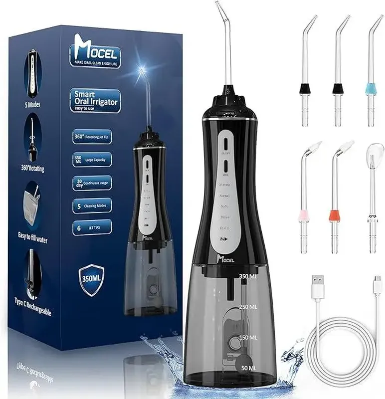 Ирригатор для ротовой полости с водной зубной нитью, 5 режимов, 350 мл. Беспроводное водяное средство для чистки зубов, 6 насадок, IPX7. Водонепроницаемый портативный мощный аккумулятор для путешествий и дома. Уход за брекетами и мостами. Об этом товаре 【5 различных режимов и самый новый дизайн для всей семьи】 Вы ищете хорошую зубную нить для нескольких членов вашей семьи? Водная зубная нить Mocel имеет 5 режимов чистки и 6 насадок: Сильная, нормальная, мягкая, импульсная и детская для членов семьи. Удаление до 99,9% зубного налета в области зубов для улучшения здоровья десен. Мягкий режим и детская форма идеально подходят для детей и чувствительных десен. Дизайн смотрится элегантно и имеет небольшую форму талии, которую можно плотно держать. 【Мощная вода для очищения зубов и улучшения состояния десен】Скажите низу неприятного запаха изо рта! Оснащен мощным насосом, очиститель зубов с водой имеет частоту пульса 2200-3000 ударов в минуту, обеспечивая мощную подачу воды. Давление воды 50-150 фунтов на квадратный дюйм тщательно удаляет остатки пищи и пятна между зубами и под линией десен, сохраняет свежесть полости рта и отбеливает зубы. 【Простота в использовании и очистка на 360° во всех направлениях】Вы не знаете, как использовать беспроводную водную зубную нить? Использовать ирригатор Mocel просто. 2 шага, чтобы начать пользоваться зубной нитью. Чтобы обеспечить вам удобство чистки зубов. Его вращающаяся на 360 градусов насадка позволяет очистить все труднодоступные места от застрявших остатков пищи. 【20-28 дней непрерывного использования】 Благодаря мощному экологически чистому аккумулятору полная зарядка занимает 4 часа и около 28 дней непрерывного использования. Оснащен USB-кабелем типа C, который чаще всего применяется к различному зарядному оборудованию. 【Большая емкость 350 мл и водонепроницаемость IPX7】Так, с резервуаром для воды емкостью 350 мл! не нужно доливать воду несколько раз. Наша зубная нить для воды может потреблять больше воды, чем другие портативные ирригаторы на рынке. Съемный резервуар для воды легко чистится. Зубные нити для воды имеют внутреннюю водонепроницаемую конструкцию, ирригатор для ротовой полости Mocel надежно предотвращает утечку воды, его можно использовать для душа в ванной, его можно мыть для очистки (произвольно, что резиновое основание плотно закрыто)