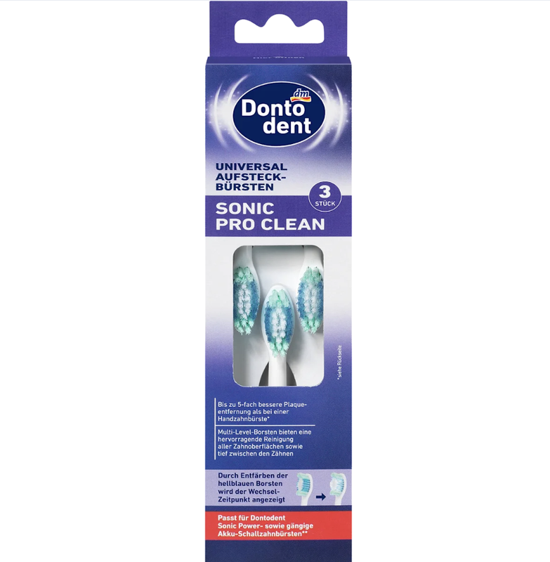 Сменные насадки для щетки Для тщательной очистки зубов Нежный для десен С индикаторами точек смены Насадки для щетки Sonic Pro Clean от Dontodent обеспечивают бережное очищение ваших зубов. Благодаря закругленным мягким щетинкам они нежно относятся к деснам и обеспечивают приятную чистку. Щетинки адаптируются к контурам ваших зубов, тщательно очищая их поверхность и удаляя зубной налет даже глубоко между зубами. Индикаторные щетинки также выгорают, показывая, когда пора заменить насадку. Эти практичные щетки идеально подходят для эффективной гигиены полости рта и обеспечивают сияющую улыбку. *Упаковка содержит минимум 70% переработанного материала.