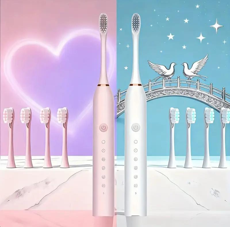 Набор состоит из 2 электрических зубных щеток и из 4 шт насадок каждый. USB зарядка. 6 режимов чистки