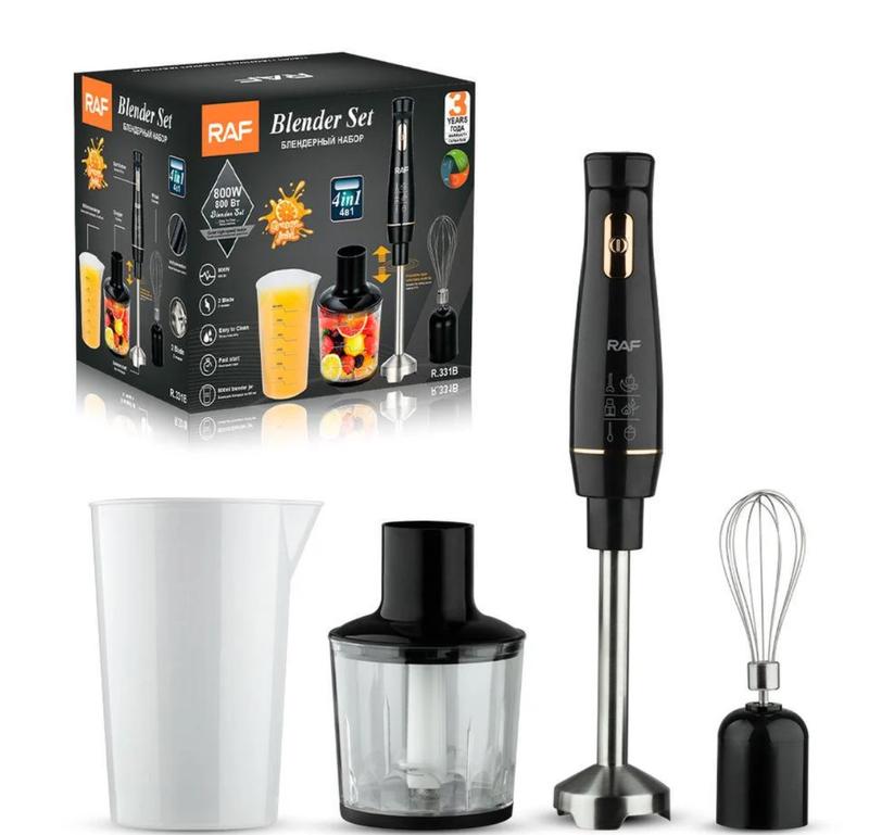 Характеристики: Тип: ручной блендер / блендер с чашей Тип блендера: погружной Мощность: 800 Вт Цвет - белый Объем мерного стакана: 600 мл Длина кабеля: 1 м Скорость вращения: 10 000 - 14500 об/мин Погружающая часть и лезвия: нержавеющая сталь Материал корпуса: пластик Защита от перегрева: есть Комплектация: Погружающий блендер 4в1 Raf R 331W Чаша Стакан Насадка-миксер Инструкция Упаковка