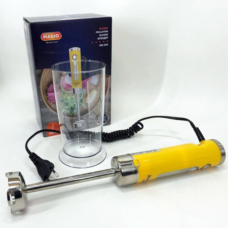 Блендер Magio MG-646 позволит вам разнообразить ваше меню и приготовить новый кулинарный шедевр. Мощность блендера составляет 800 Вт, что обеспечивает бесшумную эффективную работу в течение длительного времени. Погружная часть выполнена из нержавеющей стали -- залог устойчивости к износу и долговечности. Блендер может работать на 13 плавно переключающихся скоростях. Переключатель находится на рукоятке прибора, что весьма удобно. В комплект входит пластиковый мерный стакан. Эти свойства в сочетании с компактным дизайном делают блендер незаменимым помощником на вашей кухне. Характеристики: - Тип: погружной блендер - Мощность: 800 Вт - Тип управления: механическое - Материал ножки блендера: нержавеющая сталь - Материал корпуса: пластик - Скорости: 13 шт - Мерный стаканчик: 600 мл - Скоростной режим: турбо - Гибкий спиралевидный шнур для комфортного использования и хранения - LED подсветка - Эргономическая рукоятка - Ножка и ножи блендера из нержавеющей стали - Надежная фиксация - Низкий уровень шума - Цвет: желтый - Производитель: Magio Основные функции: - Измельчение - Смешивание