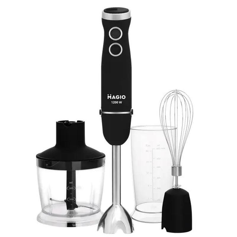Виробник: Magio Кілька примірників у наявності Блендерний набір MG-655 дозволить різноманітнити ваше меню та приготувати новий кулінарний шедевр. Потужність блендера становить 1200 Вт, що забезпечує безшумну ефективну роботу протягом тривалого часу. Занурювальна частина й ніж виконані з нержавіючої сталі - запорука стійкості до зношування і довговічності. Ергономічний держак з приємним покриттям SOFT TOUCH. Блендер може працювати на 12 швидкостях, що плавно перемикаються. Перемикач знаходиться на держаку приладу, що дуже зручно. До комплекту входять віничок для збивання та міні-подрібнювач об'ємом 500 мл. Ці властивості в поєднанні з компактним дизайном роблять блендер незамінним помічником на вашій кухні. -- Тип 3 в 1 подрібнювач, блендер, міксер -- Потужність 1200 Вт -- Кількість швидкостей 12 (з плавним регулюванням) -- Швидкісний режим Турбо -- Рівень шуму Низький -- Підсвічування Led -- Рукоятка Ергономічна з покриттям Soft Touch -- Ніжка блендера Нержавіюча сталь -- Ніж блендера Нержавіюча сталь -- Фіксація Надійна -- Покриття чаши подрібнювача Soft Touch -- Об'єм чаші подрібнювача 0,5 л -- Об'єм мірного стаканчика 0,6 л -- Вінчик для збивання Нержавіюча сталь -- Шнур Гнучкий спіралеподібний (для комфортного використання та зберігання) -- Основні функції Подрібнення, змішування, збивання Виробник: Magio Гарантія: 12 місяців Джерело живлення: мережа 220 В Додаткові характеристики: Низький рівень шуму, ергономічна рукоятка Захист: Від перегріву Кількість швидкостей: 12 з плавним регулюванням Комплектація: Моторний блок Насадка блендера Редуктор віночка Насадка-вінчик Кришка редуктора Ніж-подрібнювач Чаша чоппера Інструкція Гарантійний талон Матеріал ніжок блендера: Метал Матеріал чаши / стакану: Пластик Потужність: 1200 Об'єм, л: 0.6 Керування: Механічний