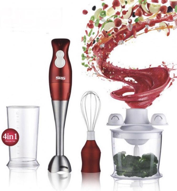 Блендер DSP 4в1 200W Model:KM1004 Для того чтобы приготовление пищи приносило Вам удовольствие, и не отнимало много времени, необходимо пользоваться техникой для кухни. Как не вспомнить про такой кухонный атрибут, как блендер. Мы рекомендуем Вам купить блендер DSP . Блендер DSP с легкостью справится с взбиванием жидких смесей до придания им воздушной структуры, смешиванием коктейлей, муссов и других жидкостей, измельчит всевозможные продукты до рубленного или пастообразного состояния, приготовит картофельное или другое пюре, суп-пюре. Также, ему доступна колка льда. Блендер DSP относится к ручному (погружному) типу. Во время работы, Вы погружаете рабочую часть блендера (ножку блендера с ножом или венчик) в емкость с продуктами. Он портативен и легко поддается манипуляциям. Погружной блендер миниатюрнее и легче ручного миксера, а также функциональнее своих стационарных аналогов. Ручной блендер DSP обладает веретенообразной формой. Корпус сделан из нержавеющий стали, с красной вставкой. В целом, модели характерен приятный, стильный дизайн, который хорошо впишется в интерьер Вашей кухни. На корпусе погружного блендера DSP имеются две кнопки. Первая отвечает за работу на стандартной скорости, вторая кнопка выполняет функцию «турбо» - кратковременного повышения скорости вращения насадок до максимального уровня. В результате, мы получаем более тщательное смешивание, взбивание и измельчение. К нижней части ручного блендера DSP крепятся три рабочие поверхности: насадка- блендер для смешивания и измельчения; венчик, предназначенный для взбивания жидких смесей; чоппер со стальным двухлопастным ножом и крышкой, для измельчения твердых продуктов. Пластиковая «юбка» насадки-блендера защищает нож от ударов о края посуды. В комплект с блендером DSP входит практичный держатель для аксессуаров, который крепится к чаше чоппера. На нем удобно размещаются ручка блендера с электромотором, насадка блендера и венчик. В таком положении, блендер готов к хранению. Держатель, насадки блендера и чаша чоппера пригодны для мытья в посудомоечной машине. Технические характеристики: 2 уровня скорости Материал ножей: нержавеющая сталь Насадка-венчик Насадка-чоппер Держатель для хранения Съемная ножка блендера Уровень шума ≤ 80 дБ Мощность: 200Вт