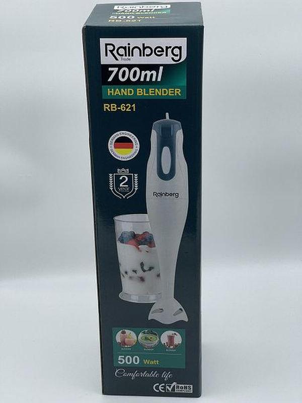Погружной Блендер Rainberg RB-621 Особенности блендера Rainberg: При хранении компактный блендер занимает минимум места, благодаря чему прибор станет отличным решением даже для очень маленькой кухни. Блендер Rainberg RB-621 имеет острые ножи из нержавеющей стали и пластиковую ногу, которая удобно снимается и легко моется. Погружной блендер поможет вам значительно сократить время подготовки ингредиентов для самых разных блюд. Блендер RB-621 используется для смешивания майонеза, соусов, детского питания, для рубки лука, твердого сыра, мяса, приготовленных фруктов и овощей, коктейлей. Характеристики: Функции: измельчения, смешивания Тип: блендер погружной Мощность: 300 W Количество скоростей: 1 Ножи из нержавеющей стали Мерный пластиковый стакан 700 мл; Имеет ушко для подвешивания Материал корпуса: пластик Питание: от сети 220-240V 50Hz