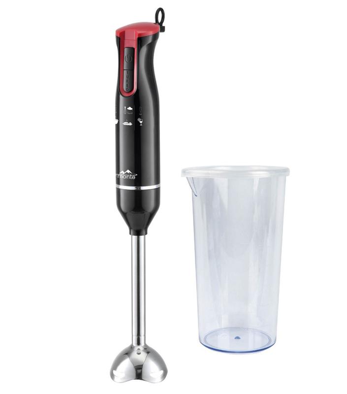 Блендер Monte MT-1906 - предназначенный для измельчения пищи, приготовления эмульсий, пюре, взбивания напитков, муссов. Устройство также имеет отличную мощность в 700 Вт. Он легок и удобен в использовании, отменно работает и не занимает много места. Плюс ко всему, блендер имеет защиту от разбрызгивания, так что вы будете сохранять чистоту на кухне. Объём мерного стакана 0,6 л. Его ножи из нержавеющей стали не боятся коррозии и повреждений, вроде сколов. Характеристики: - Тип: погружной блендер - Мощность: 700 Вт - Тип управления: механическое - Мерный стакан: 600 мл с крышкой - Материал ножки блендера: нержавеющая сталь - Материал корпуса: пластик - Материал стакана: пластик - Номинальное напряжение: 220-240 В - Цвет: черный с красным - Производитель: Monte