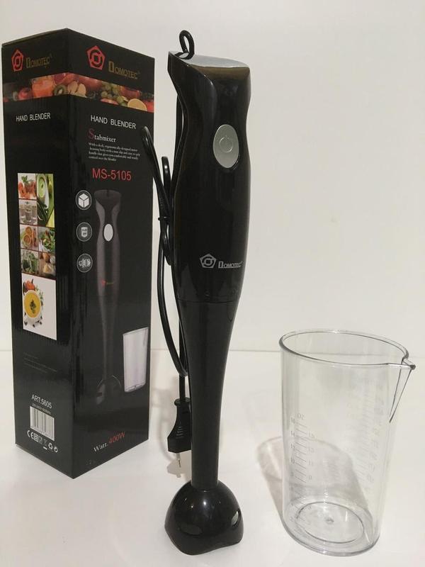 Блендер Domotec MS 5105 допоможе в різних ситуаціях, коли потрібно подрібнити або змішати що-небудь, а така потреба виникає щодня. Блендер використовується для змішування майонезу, соусів, дитячого харчування, для рубання цибулі, льоду, твердого сиру, м'яса, фруктів і овочів, коктейлів. Матеріал ножів – високоякісна нержавіюча сталь, а пластикова нога зручно знімається та легко миється. Простота його використання не може не тішити. Він компактний, легкий і зручно тримати в руці. Мірна чаша, що постачається в комплекті, дозволить відміряти продукти, необхідні для обробки. Ручний блендер Domotec MS-5105, характеристики: Функції: подрібнення, змішування; Потужність: 400 Вт; Кількість швидкостей: 1; Знімна нога; Має вушко для підвішування; Матеріали виготовлення: Корпус: пластик; Знімна нога: нержавіюча сталь; Ножі: нержавіюча сталь; Мірна чаша: прозорий пластик Живлення: 220-240V 50/60Hz; Колір чорний; Довжина кабелю живлення: 1,15 м; Вага блендера: 0,5 кг; Розмір блендера: 38x6 см; Розмір чаші: 15х9 см.