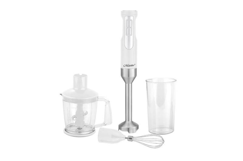 Универсальный кухонный блендер для измельчения, взбивания и приготовления разнообразных блюд, включая смузи, коктейли, соусы, фруктовые и овощные салаты, овощи для рагу, мясо для фарша, яйца и сливки. Преимущества: мощный двигатель, двойные лезвия из нержавеющей стали, насадка-венчик, удобная ручка, стойкое основание, импульсный режим.