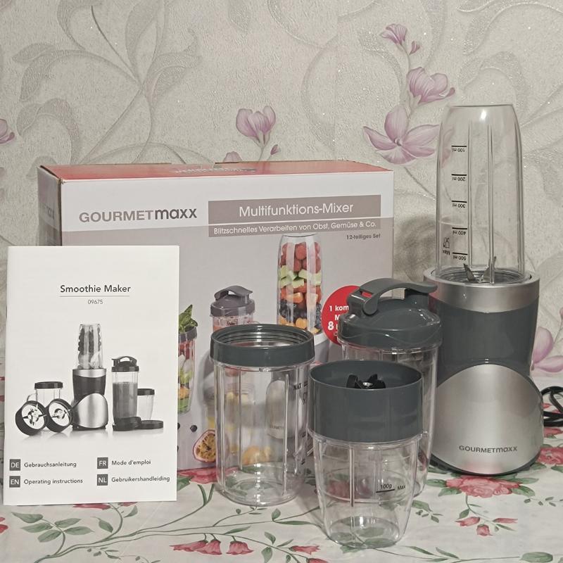 Продам блендер, смузи шейкер Gourmetmaxx Multifunctions-Mixer, мощностью 380 Ватт. В комплекте блендер, 4 колбы один на 100грам, 2 на 380мл и один на 0,5 литра, с крышками (все видно на фото), оригинальная коробка и инструкция на немецком и английском. Все новое, включался 1 раз для проверки, приобретается в Германии.