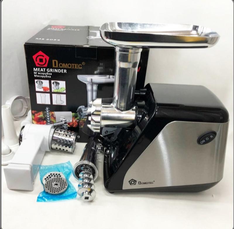 ХАРАКТЕРИСТИКИ ПОБУТОВОЇ ЕЛЕКТРИЧНОЇ М’ЯСОРУБКИ ДОМОТЕК: Функция Реверс; Защита от перегрузки; Медный двигатель; Количество грат: 3; Материал корпуса: Пластик/Металл; Насадки: Для колбасных изделий; Кеббе; Для томатов; 2 Для терки/ шинковки; Особенности: Не скользящие резиновые ножки; Широкий лоток; Низкий уровень шума; Сфера использования: Для дома. КОМПЛЕКТАЦІЯ: Электрическая бытовая мясорубка с функцией соковыжималки; 3 вида форменных дисков; Крестоподобный рожущий нож; Лоток для м’яса; Насадки для колбас и кеббе; Насадка для томатов; 2 насадки для терки/ шинковки; Инструкция