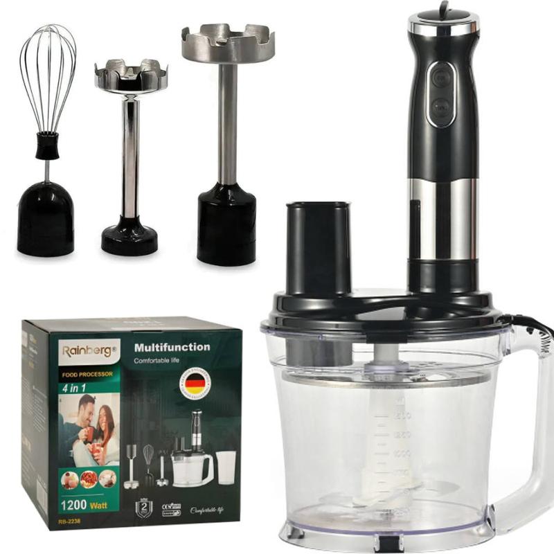 Блендер Rainberg RB-2238 - с его помощью вы сможете легко и быстро измельчать, смешивать и взбивать продукты, создавая идеальные рецепты для своей кухни. Преимущества: - Быстрое и эффективное измельчение и смешивание ингредиентов - Эргономичный дизайн - Удобно в использовании - Острые лезвия из стали - Вместительная чаша Описание: Блендер погружной Rainberg RB-2238 представляет собой высококачественное и мощное устройство, которое обеспечивает эффективное измельчение и смешивание различных продуктов. С его помощью вы сможете легко приготовить смузи, коктейли, пюре, соусы и другие блюда с нежной и однородной текстурой. Благодаря мощности 1200Вт и инновационному дизайну, этот блендер обеспечивает быстрый и равномерный результат. Насадки, входящие в комплект блендера, предоставляют широкий функционал. Блендер Rainberg RB-2238 идеально подходит для использования на домашней кухне. Он прост в использовании, легко моется и обеспечивает надежное и эффективное выполнение кулинарных задач. Благодаря своей функциональности и производительности, этот блендер станет незаменимым помощником на кухне для приготовления широкого спектра блюд и напитков. Характеристики: - Тип: миксер блендер / блендер с чашей - Мощность: 1200 Вт - Материал корпуса: пластик, нержавеющая сталь - Материал ножей: сталь - Количество скоростей: 2 - Цвет корпуса: черный - Чаша: 1.5 л - Мерный стакан: 0,5л - Количество насадок для нарезки и шинковки: 1 (двухсторонняя: терка + шинковка) - Количество съемных ног: 2 Комплектация: - Погружной блендер Rainberg RB-2238 - Чаша-измельчитель - Диск для терки и шинковки - Ножи для циркулярной шинковки - Насадка-венчик - Насадка-лопатка - Насадка универсальный измельчитель - Мерный стакан - Инструкция - Упаковка