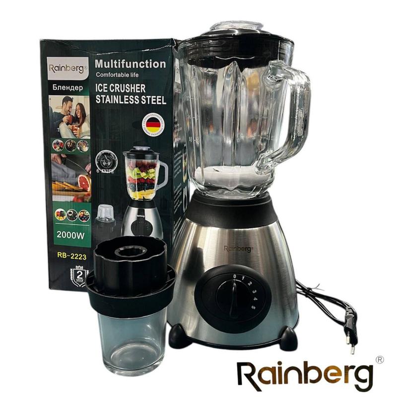 Блендер с кофемолкой Rainberg RB-2223 2000 Вт Rainberg RB-2223 - качественный стационарный блендер с широким функционалом. Он быстро измельчит овощи для салата или превратит в пюре приготовленный суп. Стеклянный кувшин-чаша вмещает 1.5 л. Масса внутри кувшина тщательно измельчается в горизонтальном и вертикальном направлениях. Мощность блендера 2000 Вт, есть три скорости. За счет этого легко подобрать режим измельчения любого товара. Блендер устойчивый, компактный, съемный нож выполнен из нержавеющей стали. Существует функция измельчения льда. Особенности: - Оснащен ударопрочной стеклянной чашей, емкостью 1500 мл; - Двигатель мощностью 2000 Вт; - Имеет 3 скорости работы; - Импульсный режим; - Благодаря своей форме стакана масса циркулирует внутри в вертикальном и горизонтальном положении, обеспечивая тщательное и качественное измельчение; - острые съемные ножи с лазерной заточкой 8 лепестков, из высококачественной нержавеющей стали; - Идеально подходит для колки льда, измельчения кофейных зерен и специй; - Антискользящие устойчивые ножки. Характеристики: - Тип: стационарный; - Тип управления: электронное; - Материал корпуса: метал; - Материал кувшина блендера: стекло; - Лезвия: нержавеющая сталь; - Мощность: 2000 Вт; - Объем: 1,5 л; - Количество скоростей: 3; - Импульсный режим обработки особо твердых продуктов: да; - Міні-млинка: да; - Специальные ножи для измельчения льда: да; - Питание: от сети 220-240V 50Hz; - Цвет: серебристый; - Размеры (ВхШхГ): 38 х 20 х 19 см; - Вес: 3 кг. Комплектация: - Блендер Rainberg RB-2223; - Глечик; - Кавомолка; - Инструкция - Заводская упаковка.