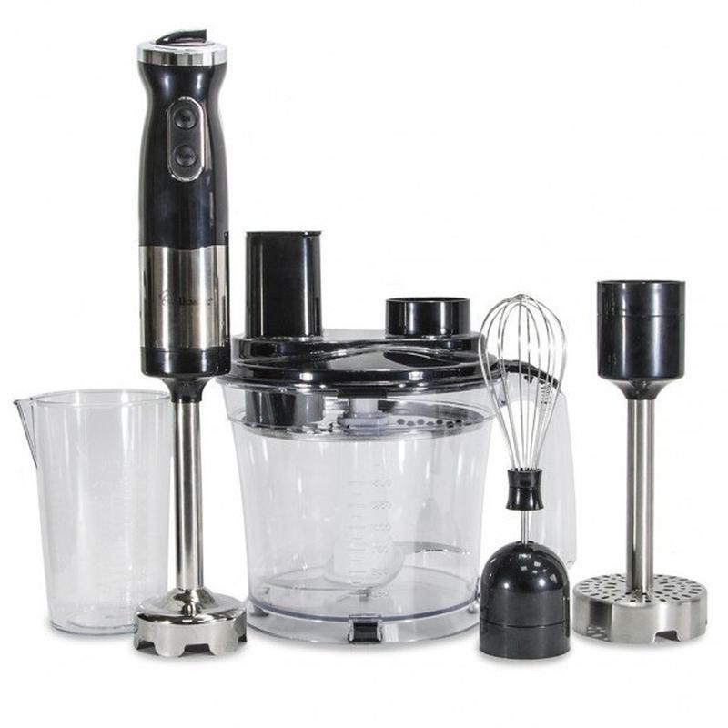 Погружной блендер Domotec MS-5107 – это компактный бытовой прибор мощностью 800 Вт, который будет прост в использовании, надёжен и безопасен. Модель можно использовать для измельчения, смешивания и взбивания продуктов. Благодаря мощности 800 Вт и острому ножу из нержавеющей стали он быстро перемалывает фрукты, ягоды, овощи, орехи, делает фарш. Скорость работы блендера можно плавно регулировать. Так же есть турбо режим. В большой чаше измельчителе на 1.5 литра с диском для терки и шинковки отлично получится фарш, паштет, тесто для блинчиков и многое другое. Для приготовления смузи и коктейлей подойдет стакан емкостью 600 мл. Характеристики: - Тип: погружной мультифункциональный; - Мощность: 800 Вт; - Материалы изготовления: - Корпус моторного блока блендера: нержавеющая сталь + пластик; - Ножи: нержавеющая сталь; - Чаша и мерный стакан: пластик - Погружная часть съемных ног и венчика: нержавеющая сталь - Количество насадок для нарезки и шинковки: 1 (двусторонняя: терка + шинковка); - Количество съемных ног: 2; - Насадка-венчик: да - Насадка-лопатка: да - Плавное изменение скорости: да - Объем: - Чаша: 1.5 л; - Мерный стакан: 0,5 л; - Размеры: - Моторный блок блендера: 20х5 см - Чаша измельчителя: 16х18 см - Мерный стакан: 15х9.5 см - Насадка лопатка, длина: 22 см - Насадка универсальный измельчитель, длина: 18 см - Чаша измельчитель с крышкой и моторный блоком в сборе, длина: 40 см - Длина сетевого шнура: 1,1 м - Общий вес комплекта: 2 кг Комплектация: - Блендер (моторный блок) - Чаша-измельчитель - Крышка-редуктор чаши-измельчителя - Диск для терки и шинковки - Опорный вал диска для терки и шинковки - Ножи для циркулярной шинковки - Переходник-редуктор на венчик - Насадка-венчик - Насадка-лопатка - Насадка универсальный измельчитель - Мерный стакан - Инструкция (англ. язык) - Картонный упаковочный бокс