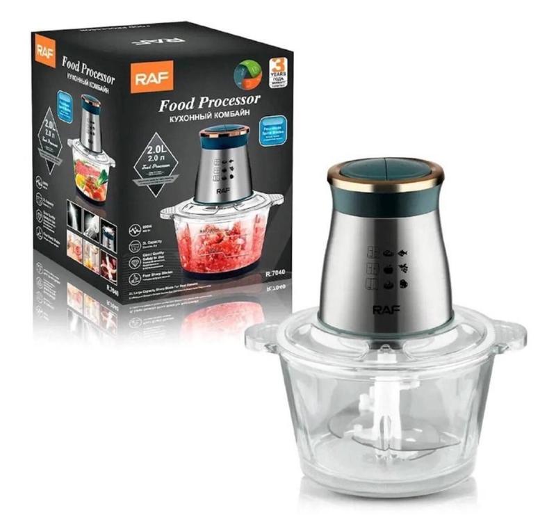 Кухонный блендер RAF 7040 2L 800 Вт RAF 7040 - это портативный и многофункциональный измельчитель, блендер, мясорубка, мельница для быстрого измельчения как мягких продуктов, таких как: фрукты, перец, смешивания разных соусов, яиц, так и для твёрдых продуктов, таких как: мясо, овощи, зерна кукурузы, бобовые, корни растений, кофе, бобы, рис, с возможностью применения не только в домашних условиях, но и для ресторанов и баров. RAF 7040 имеет 2 скорости работы: для твердых и мягких продуктов. Безопасность конструкции обеспечивает двойная крышка, которую нельзя открыть пока перемешивание не закончится. Основное: ✅ Чоппер предназначен для взбивания, измельчения и шинковки. Он измельчает не только овощи, но и даже мясо, превратив его в готовый фарш. ✅ Чоппер мгновенно нарезает и перемалывает продукты, достаточно только одного нажатия на кнопку. ✅ Благодаря простой системе крепления, блендер легко разбирать и мыть. Блендер имеет достаточно компактные размеры, но в то же время очень вместительную чашу. ✅ Блендер-чоппер порадует Вас своими возможностями, упростит жизнь и сэкономит время. Также он станет хорошим помощником на кухне каждого, кто заботится о своем здоровье и просто любит вкусно покушать! Характеристики: ✅ Марка: РАФ ✅ Материал: стекло ✅ Материал лезвия: нержавеющая сталь ✅ Мощность 800 Вт ✅ Колличество скоростей: 2 ✅ Частота: 50 Гц-60 Гц ✅ Напряжение: 220 В ✅ Емкость: 2 л ✅ Цвет: прозрачный ✅ Вес: 2250 кг