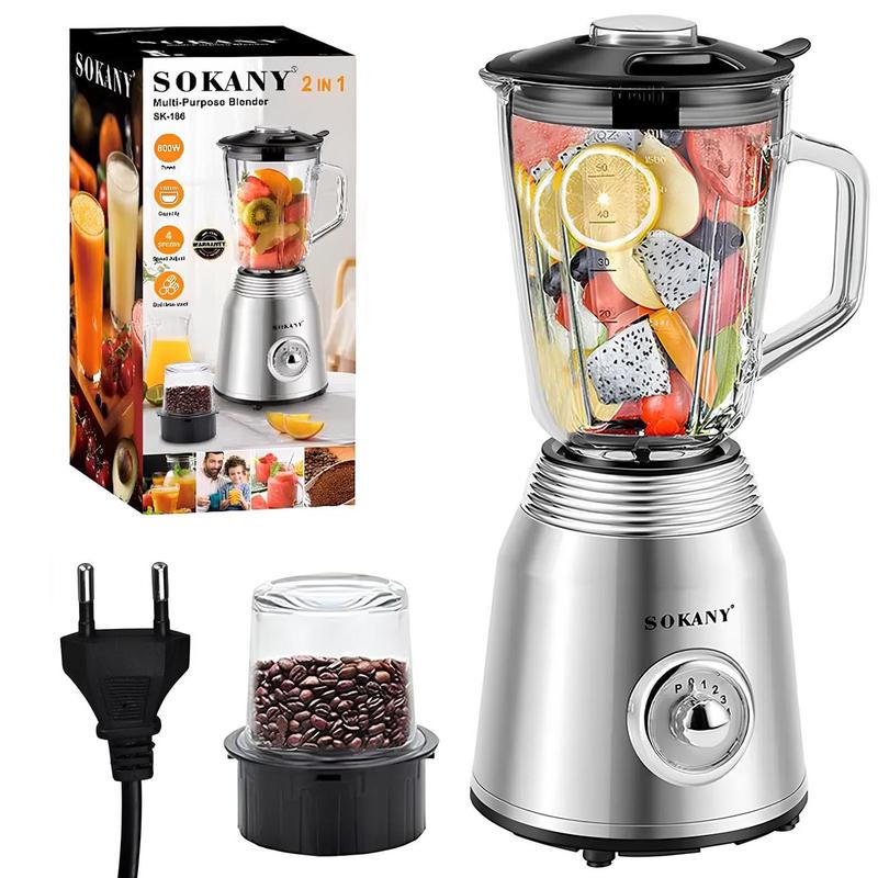 Багатофункціональний блендер Sokany SK-186 - високоякісний кухонний прилад, що забезпечує широкий спектр можливостей для приготування різних страв і напоїв. Переваги: - 4 швидкісних режими - Ефективне подрібнення - Чаша зручного об'єму - Імпульсний режим - Функція помолу кави - Функція подрібнення льоду - Отвір для додавання продуктів - Леза з нержавіючої сталі - Захист від перегріву - Легке очищення Опис: Стаціонарний блендер Sokany SK-186 - високоякісний кухонний прилад, оснащений потужним мотором 800 Вт. Цей блендер з чашею легко справляється з подрібненням льоду, горіхів, фруктів і овочів. Чаша об'ємом 1,5 літра виготовлена з міцного скла, що витримує високі температури та удари, роблячи її ідеальною для приготування гарячих супів та холодних напоїв. Завдяки чотирьом режимам швидкості ви можете легко регулювати консистенцію подрібнення відповідно до ваших потреб. Прозора чаша дозволяє контролювати процес подрібнення, а знімні деталі легко миються, що забезпечує простоту догляду за приладом. Sokany SK-186 також має функцію пульсації, що дозволяє швидко та інтенсивно перемішувати інгредієнти, роблячи його ідеальним для приготування соусів, пюре та коктейлів. Блендер для смузі оснащений високоякісними ножами з нержавіючої сталі, які забезпечують ефективне подрібнення та тривалий термін служби. Крім того, блендер має захист від перегріву, що підвищує його безпеку та надійність у використанні. Ергономічний дизайн і зручне управління роблять цей блендер незамінним помічником на вашій кухні. Блендер Sokany SK-186 поєднує в собі потужність, функціональність і зручність використання. Характеристики: - Тип: Блендер-подрібнювач / Блендер для коктейлей - Призначення: Подрібнювання, збивання, пюрування - Тип керування: Механічне - Потужність: 800 Вт - Об'єм чаші: 1.5 л - Кількість режимів швидкості: 4 - Імпульсний режим: Так - Міні-подрібнювач: Так - Подрібнення льоду: Так - Отвір для додавання інгредієнтів: Так - Живлення: Від мережі 220В - Відсік для шнура: Так - Довжина шнура: 1.3 м - Матеріал корпуса: Метал - Матеріал лез: Нержавіюча сталь - Матеріал чаші: Скло - Миття в посудомийній машині: Знімні частини - Колір: Сріблястий Комплектація: - Стаціонарний блендер SOKANY SK-186 - Чаша - Міні-подрібнювач - Інструкція - Упаковка