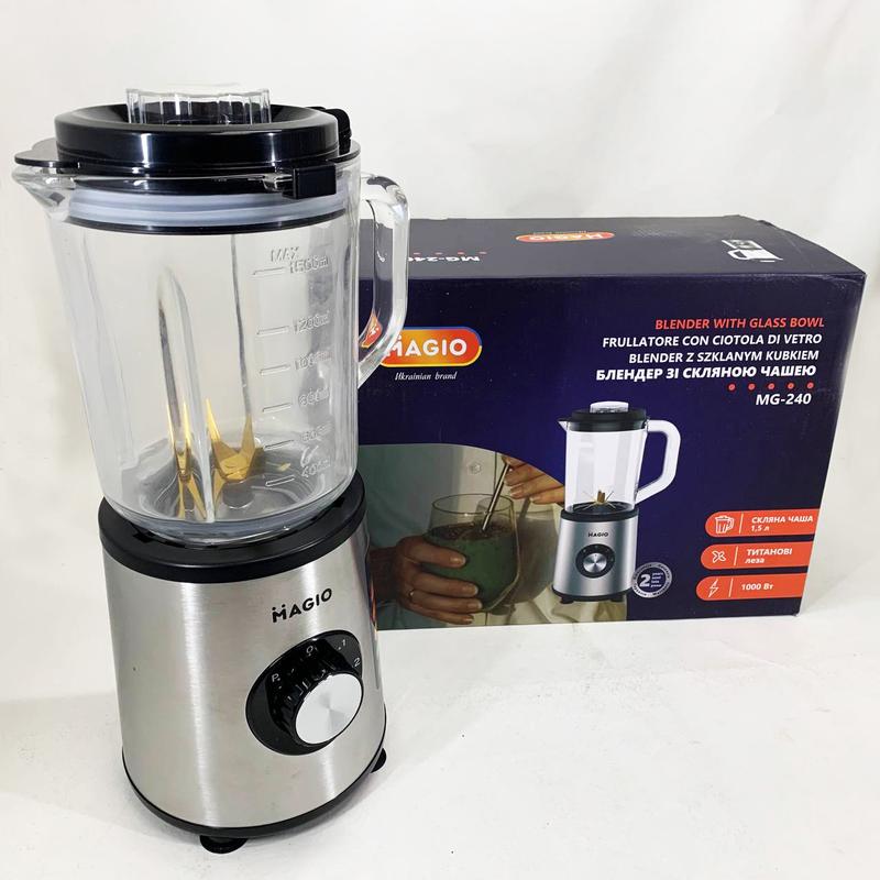 БлендерMAGIO MG-240- это стильный и мощный помощник, предназначенный для тех, кто ценит качество, надежность и удобство. Благодаря мотору на 1000 Вт он с легкостью справляется с приготовлением смузи, сорбета, детского питания, а также эффективно колет лед, что делает его универсальным выбором для любой кухни. Его стеклянная чаша объемом 1,5 литра - прочная, удобная в уходе и абсолютно безопасная для горячих или холодных ингредиентов. Острые металлические лезвия обеспечивают идеальную консистенцию даже самых плотных продуктов, а 2 скорости работы и импульсный режим позволяют точно контролировать процесс измельчения. Корпус из нержавеющей стали придает устройству современный вид и одновременно гарантирует долговечность. Благодаря антискользящим ножкам блендер устойчиво держится на поверхности, а система защиты от перегрева позаботится о безопасности во время интенсивного использования. MAGIO MG-240 - это надежность, которая всегда под рукой. Он не просто блендер, а удачное сочетание функциональности и стиля, которое станет идеальным дополнением к вашей кухне.