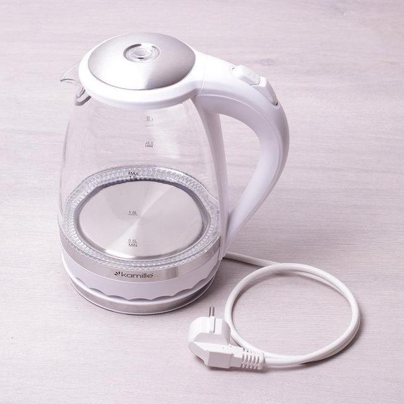 Электрические чайники Kamille изготовлены из высококачественных материалов с использованием новейших технологий производства, благодаря чему они подходят для интенсивного ежедневного использования, а их эстетичный внешний вид непременно подойдет к дизайну Вашей кухни. - Напряжение: 220-240V - Питание: 50/60Hz 1850-2200W - Материал: стекло, нержавеющая сталь, пластик - Материал ручки: бакелит - Объем: 1.5л - Цвет: белый Особенности: - стильный современный дизайн - корпус из боросиликатного стекла, прочный и устойчивый к загрязнению - синяя Led подсветка - автоматическая кнопка включения и выключения. - удобный и прочный механизм открывания свистка - скрытый нагревательный элемент из нержавеющей стали - фильтр защиты от накипи - поворотное основание на 360 градусов Уход: - Перед использованием необходимо промыть и прокипятить изделие. Во избежание опасностей, проверьте устройство, сетевой штекер и кабель питания входит в комплект. После распаковки убедитесь, что изделие без каких-либо повреждений. Меры предосторожности: - Отключайте чайник от сети перед чисткой и позволяйте устройству полностью остыть перед очисткой - Никогда не погружайте подставку и сам чайник в воду. - Не используйте едкие очистители, абразивные материалы или жёсткие чистящие средства.