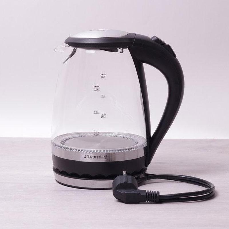 Электрические чайники Kamille изготовлены из высококачественных материалов с использованием новейших технологий производства, благодаря чему они подходят для интенсивного ежедневного использования, а их эстетичный внешний вид непременно подойдет к дизайну Вашей кухни. - Напряжение: 220-240V - Питание: 50/60Hz 1850-2200W - Материал: стекло, нержавеющая сталь, пластик - Материал ручки: бакелит - Объем: 1.5л - Цвет: чёрный Особенности: - стильный современный дизайн - корпус из боросиликатного стекла, прочный и устойчивый к загрязнению - синяя Led подсветка - автоматическая кнопка включения и выключения. - удобный и прочный механизм открывания свистка - скрытый нагревательный элемент из нержавеющей стали - фильтр защиты от накипи - поворотное основание на 360 градусов Уход: - Перед использованием необходимо промыть и прокипятить изделие. Во избежание опасностей, проверьте устройство, сетевой штекер и кабель питания входит в комплект. После распаковки убедитесь, что изделие без каких-либо повреждений. Меры предосторожности: - Отключайте чайник от сети перед чисткой и позволяйте устройству полностью остыть перед очисткой - Никогда не погружайте подставку и сам чайник в воду. - Не используйте едкие очистители, абразивные материалы или жёсткие чистящие средства.