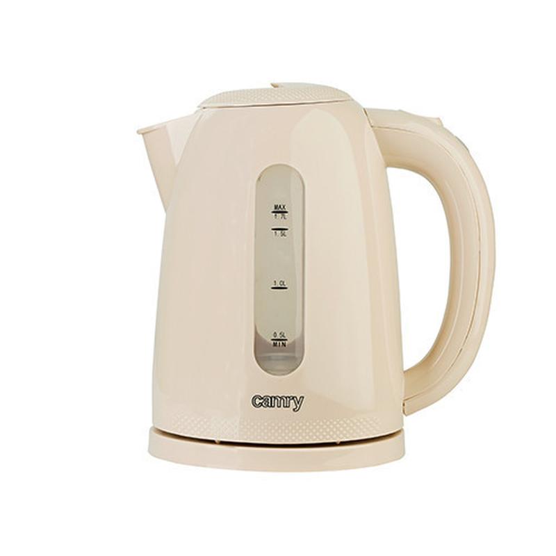 Электрочайник Camry Качественный электрочайник с контроллером для защиты от перегрева. Объем чайника Camry составляет 1.7 литра, а подставка обеспечивает оборот на 360°. Материал подставки, основы и ручки -- поликарбонат. Характеристики: - Тип: электрочайник - Тип управления: механическое - Потребляемая мощность: 2200 Вт - Материал корпуса: пластик - Нагревательный элемент: скрытый - Покрытие нагревательного элемента: нержавеющая сталь - Объем: 1.7 л - Цвет: белый, бежевый - Упаковка: цветная коробка - Производитель: Camry