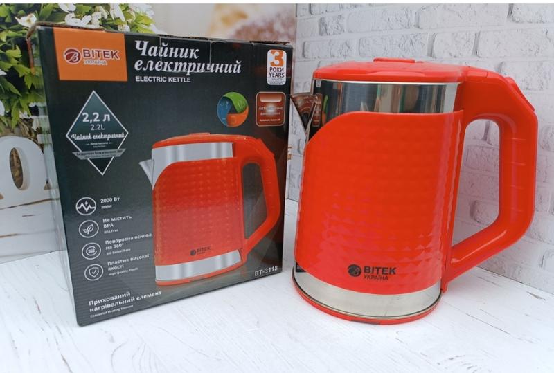 Электрочайник изготовлен из качественного материала с удобной для очистки поверхностью. Благодаря эргономичной ручке им удобно воспользоваться и держать в руках. Имеет скрытый нагревательный элемент из нержавеющей стали, что гарантирует быстрое кипячение и простую очистку. Электрочайник соединен с базой центральным контактом и легко вращается на 360 градусов, что обеспечивает полную свободу перемещения. Есть функция автоматического отключения при скипании воды. Характеристики: Защита от перегрева; Питание: 220В; Мощность 2000W; Материал корпуса: металл декорирован термостойким пластиком; Объем: 2.2 л; Автоматическое отключение; Тип нагревательного элемента: Скрытый (диск);
