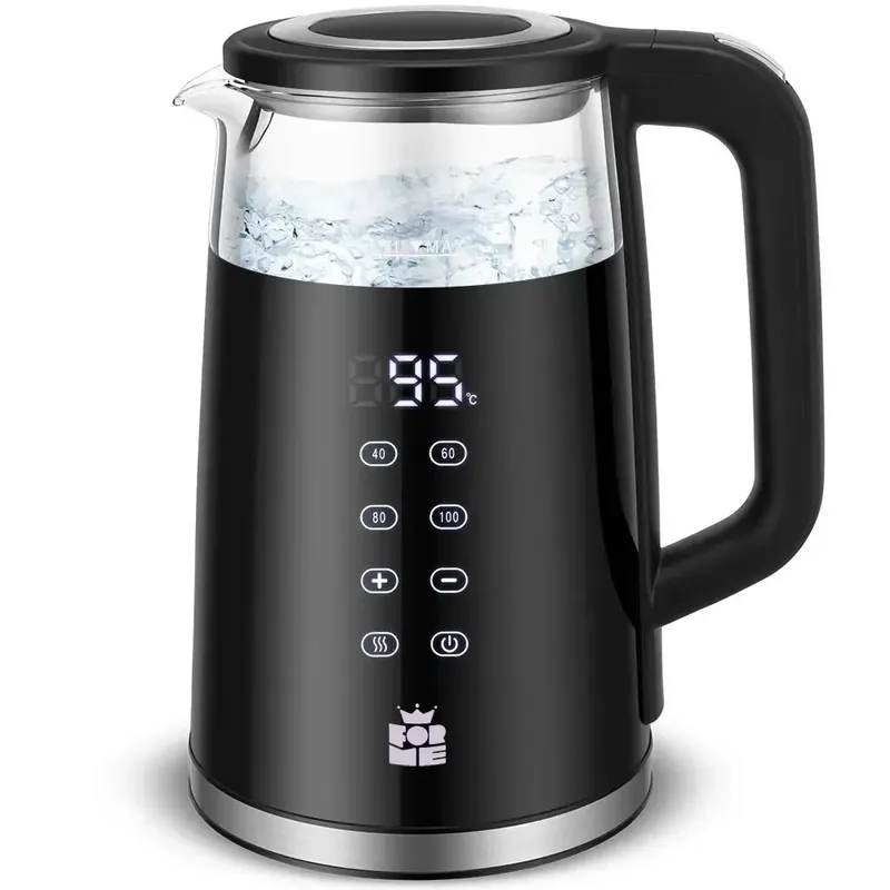 Функции: Большой цифровой дисплей температуры Четыре кнопки для четырех предустановленных температур Выбор температуры в диапазоне 40-100 ℃ с шагом 5 ℃ Функция автоматического поддержания тепла после закипания Автоматический режим ожидания для экономии энергии Показывает фактическую температуру воды Скрытый нагревательный элемент из нержавеющей стали SUS304 Двойные стенки: стеклянные внутренние и пластиковые внешние стенки. Емкость: 1,7 л, мощность: 220-240 В, 50/60 Гц, 2200 Вт Маркировка СЕ является заявлением производителя продукта о том, что продукт соответствует применимым к нему требованиям директив Европейской Комиссии. Чайник - это прибор, без которого мы вряд ли можем представить свою повседневную жизнь. Благодаря ему мы можем наслаждаться восхитительными утренними ритуалами с кофе или щекочущим нос ароматом травяного чая. Среди современных электрических чайников можно выделить терморегулируемый тип, в конструкции которого предусмотрен механизм контроля температуры воды. Эти машины предназначены для нагрева воды до нужной температуры для напитков, которые требуют меньше кипятка, например, травяного чая (без повреждения листьев) или некоторых видов кофе. Стандартный электрический чайник обычно нагревает воду до кипения. С таким чайником вам не нужно беспокоиться о тонкостях приготовления желаемого напитка. Наиболее точные водонагревательные приборы - это те, которые позволяют пользователям устанавливать точный нагрев с помощью цифрового термостата. Еще один вариант - чайник с предустановленной температурой, которую можно выбрать с помощью ручки управления или простым нажатием кнопки. Наконец, некоторые чайники просто имеют ручку, которая позволяет пользователю выбирать температуру от охлаждения до кипячения. Этот современный и практичный помощник не только обеспечит вам идеальную чашку чая или кофе, но и спасет планету, потребляя меньше энергии. Электрический чайник Чайник - это современный и практичный бытовой прибор, без которого мы вряд ли можем представить наши ежедневные ритуалы приготовления кофе или чая. Наиболее популярными являются электрические чайники, которые, в отличие от традиционных чайников, кипятят воду гораздо быстрее. Они различаются по размеру, вместимости и дизайну. Практичность обусловлена корпусом чайника, который может быть изготовлен из пластика, нержавеющей стали, стекла и керамики. Пластиковые чайники имеют небольшой вес. Приборы из нержавеющей стали тяжелые, но чрезвычайно прочные и долговечные. Для красивого дизайна и стильных решений для кухни мы рекомендуем стеклянные и керамические чайники. Если Вы большой любитель чая, мы рекомендуем чайники с регулируемой температурой нагрева. Точная температура кипения воды позволяет готовить различные виды чая и наслаждаться напитками с характерным ароматом. Поскольку чайник обычно ставится на видное место, дизайн прибора не менее важен. В зависимости от декора Вашего дома выберите электрический чайник с минималистичным, выразительным дизайном и разнообразными цветами, чтобы создать стильный акцент на Вашей кухне.
