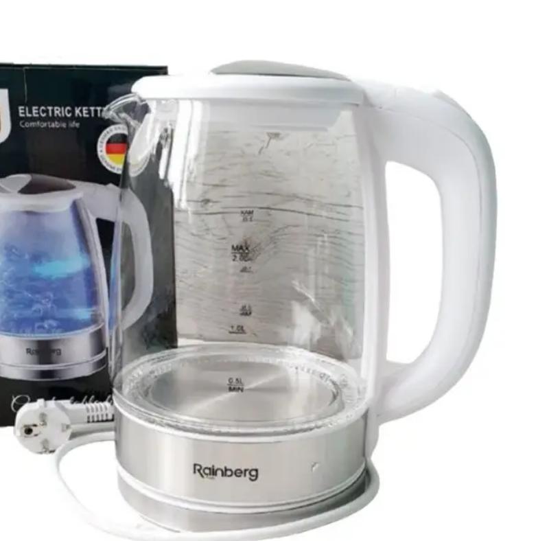 Стеклянный электрический чайник Rainberg RB-703 с дисковым нагревательным элементом. Корпус чайника изготовлен из жаропрочного, пищевого стекла сырья. Простота и удобство в повседневном использовании, безопасная эксплуатация и надежность. Прочный и устойчивый к загрязнению корпус чайника изготовлен из боросиликатного стекла, скрытый нагревательный элемент – из пищевой нержавеющей стали. Обеспечен сетчатым фильтром для очистки кипяченой воды от мелких частиц. особенности: - Мощность - 2200Вт - Автоотключение при отсутствии воды - Индикатор работы - Индикатор уровня воды - Наличие фильтра - Поворот на 360 градусов - LED подсветка чайника — Функция автоотключения — Стойкая платформа с отсеком для хранения шнура — Уникальный дизайн, вписывающийся в любой интерьер.