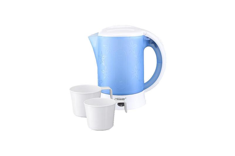 Электрочайник Maestro - MR-010 от интернет-магазина Цилиндр - компактная дорожная модель, которая будет сопровождать вас в длительных поездках. Нагревательный элемент из нержавеющей стали исключает образование накипи. Шкала уровня воды позволит наполнить чайник до нужной отметки. Есть функция защиты от перегрева. Производитель предлагает модель в двух исполнения: в белом и голубом цвете. Термостойкий безопасный пластик, из которого выполнен корпус прибора, не портит вкус воды. Наличие двух чашек в комплекте - станет приятным бонусом.
