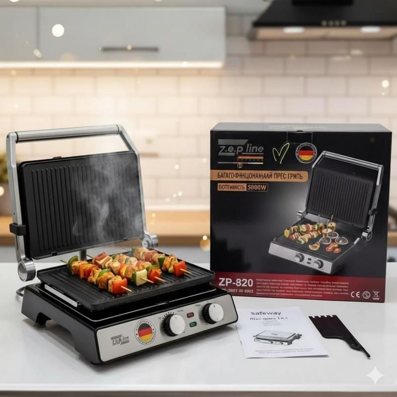 Мощный и универсальный электрогриль Zepline ZP-820 – это идеальное решение для быстрого и вкусного приготовления пищи. Благодаря высокой мощности в 3500 Вт он мгновенно нагревается и гарантирует идеальную обжарку ваших блюд. Главное преимущество этой модели — съемные антипригарные пластины, которые делают процесс очистки невероятно простым. Вы можете легко снять их и помыть вручную или в посудомоечной машине, не тратя лишнего времени. Данный гриль подходит для всего: сочных стейков, овощей, рыбы или сэндвичей. Его прочное покрытие устойчиво к царапинам и прослужит вам много лет, а стильный дизайн идеально впишется в интерьер любой кухни. Характеристики Тип: Контактный (пресс-гриль) Мощность: 3500 Вт Покрытие пластин: Антипригарное Особенности: Съемные пластины, высокая теплопроводность Материал корпуса: Металл, пластик Цвет: Металлик/Черный Комплектация Електрогриль Zepline ZP-820 Сменные антипригарные пластины Лопатка для очистки Инструкция по эксплуатации