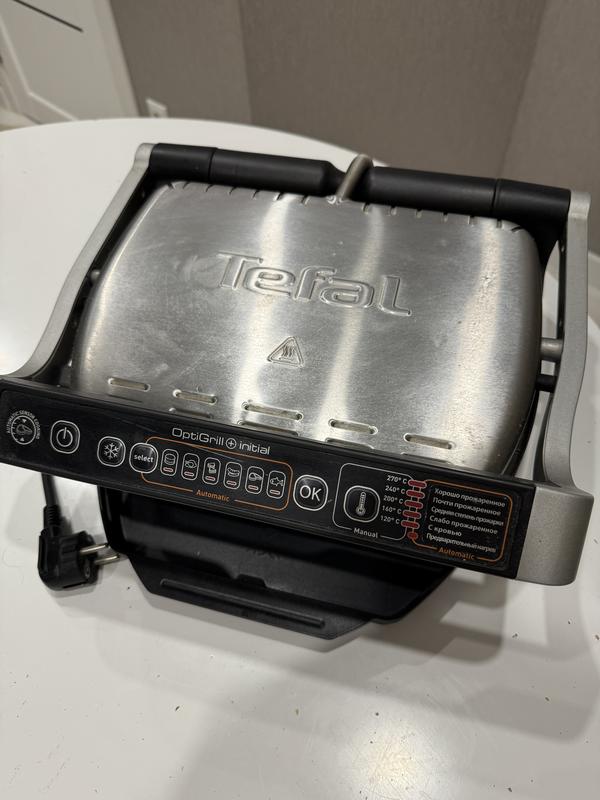 Електричний гриль Tefal OptiGrill Initial у гарному стані. Особливості: • Автоматичне визначення товщини продуктів • Сенсорне управління з індикаторами готовності • Режими приготування для різних типів м'яса • Регулювання температури від 120°C до 270°C • Антипригарне покриття робочих поверхонь • Компактний дизайн для домашнього використання Стан: вживане, зовнішній вигляд та функціональність збережені. Ідеально підходить для швидкого приготування м'яса, овочів та інших страв.